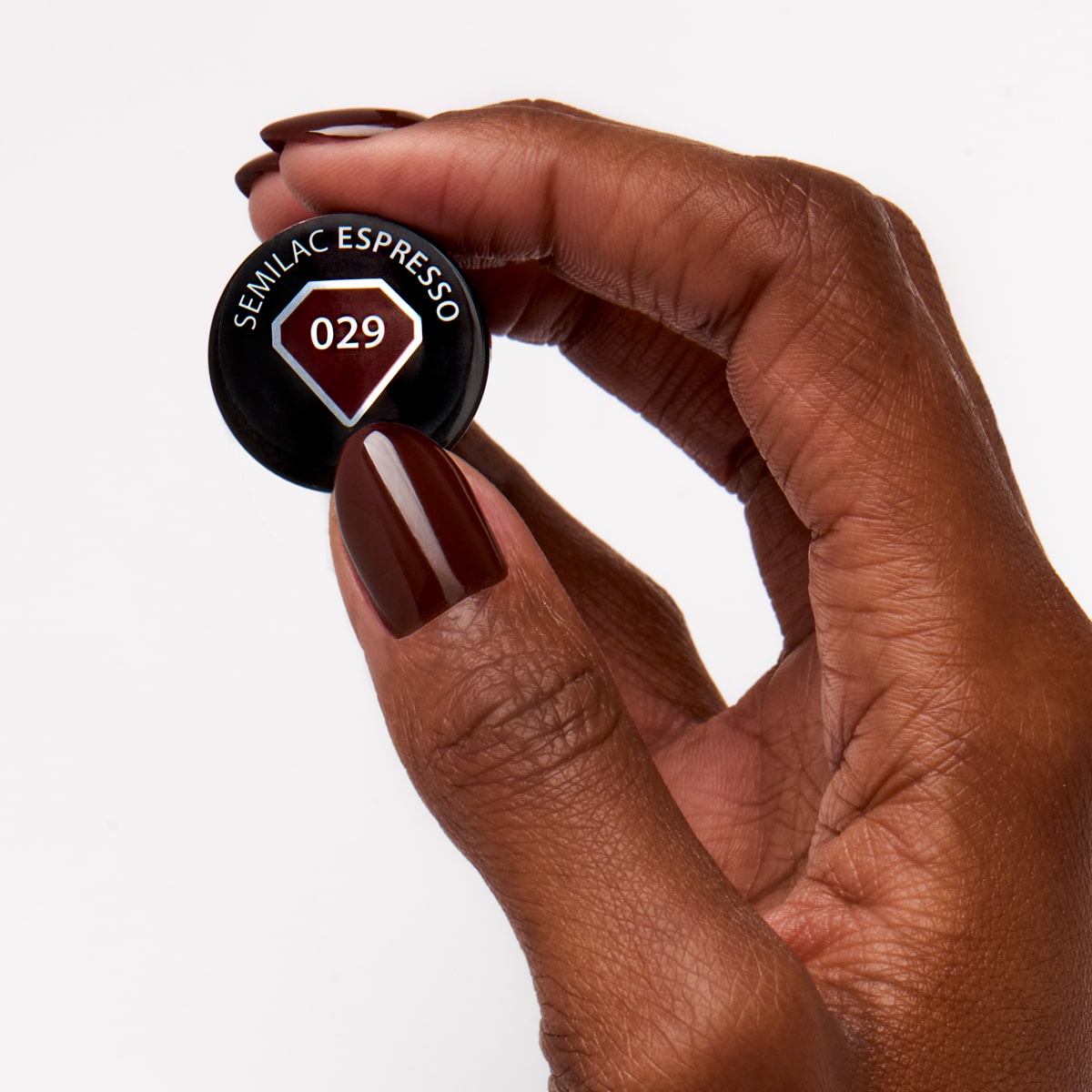En mørk brun gelélakk med varme undertoner inspirert av svart kaffe. En dyp og sofistikert nyanse som fungerer som et elegant alternativ til klassisk sort.