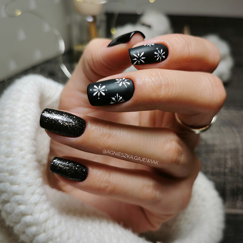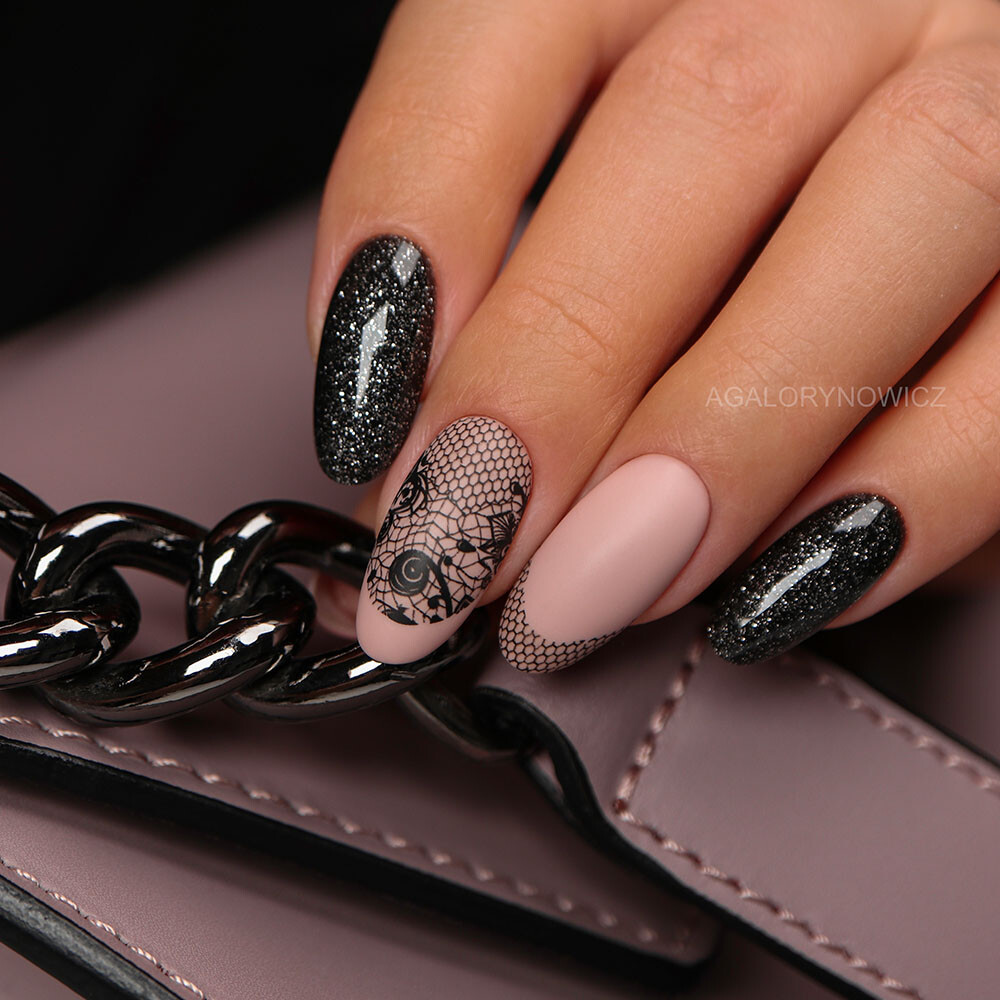 En dempet sort med tett sølvglitter som gir en stjernehimmel-effekt. En dekorativ nyanse som står alene uten behov for ekstra pynt.