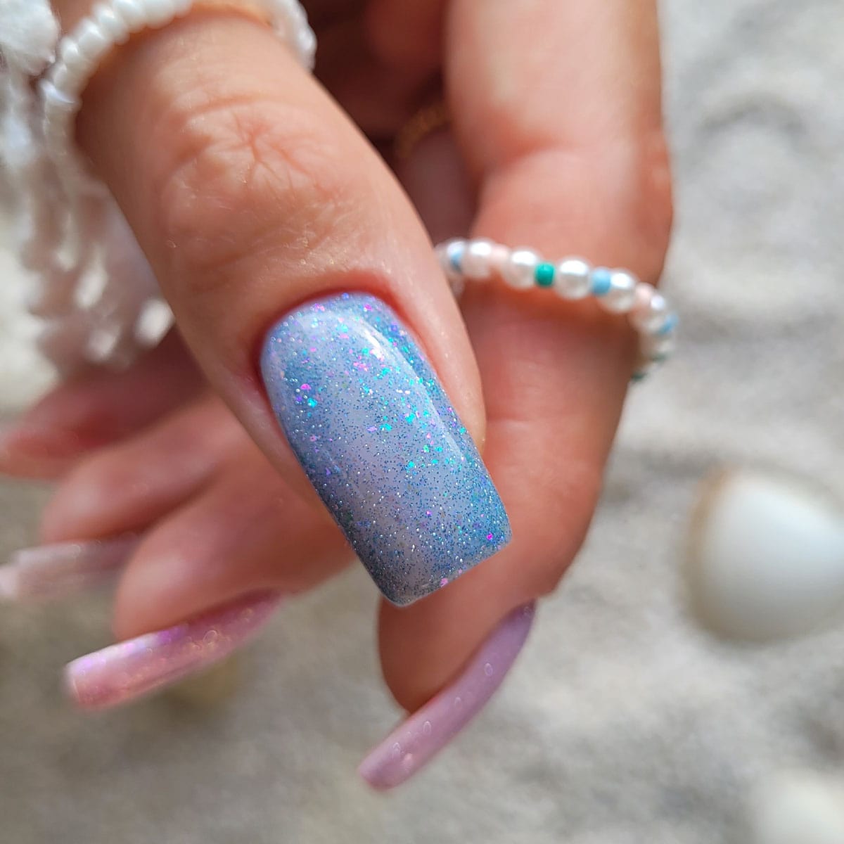 En myk, havblå tone med glitrende partikler som minner om lyset i bevegende vann. Fargen utstråler ro, friskhet og selvsikkerhet – en elegant tolkning av den moderne mermaidcore-trenden.