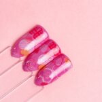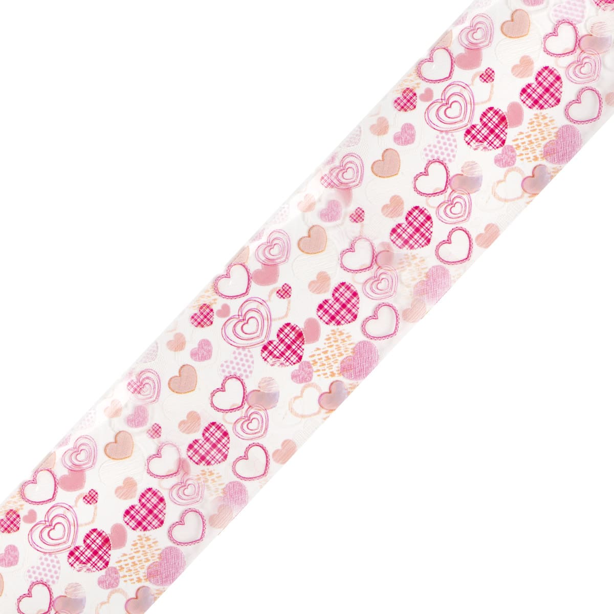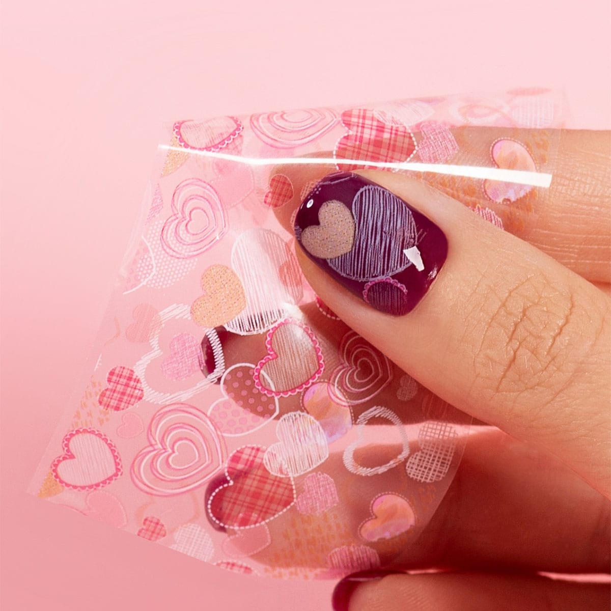 Denne negle-folien fra Semilac har et nydelig mønster av hjerter i forskjellige rosa farger, som passer perfekt til å skape unike negledekorasjoner.
