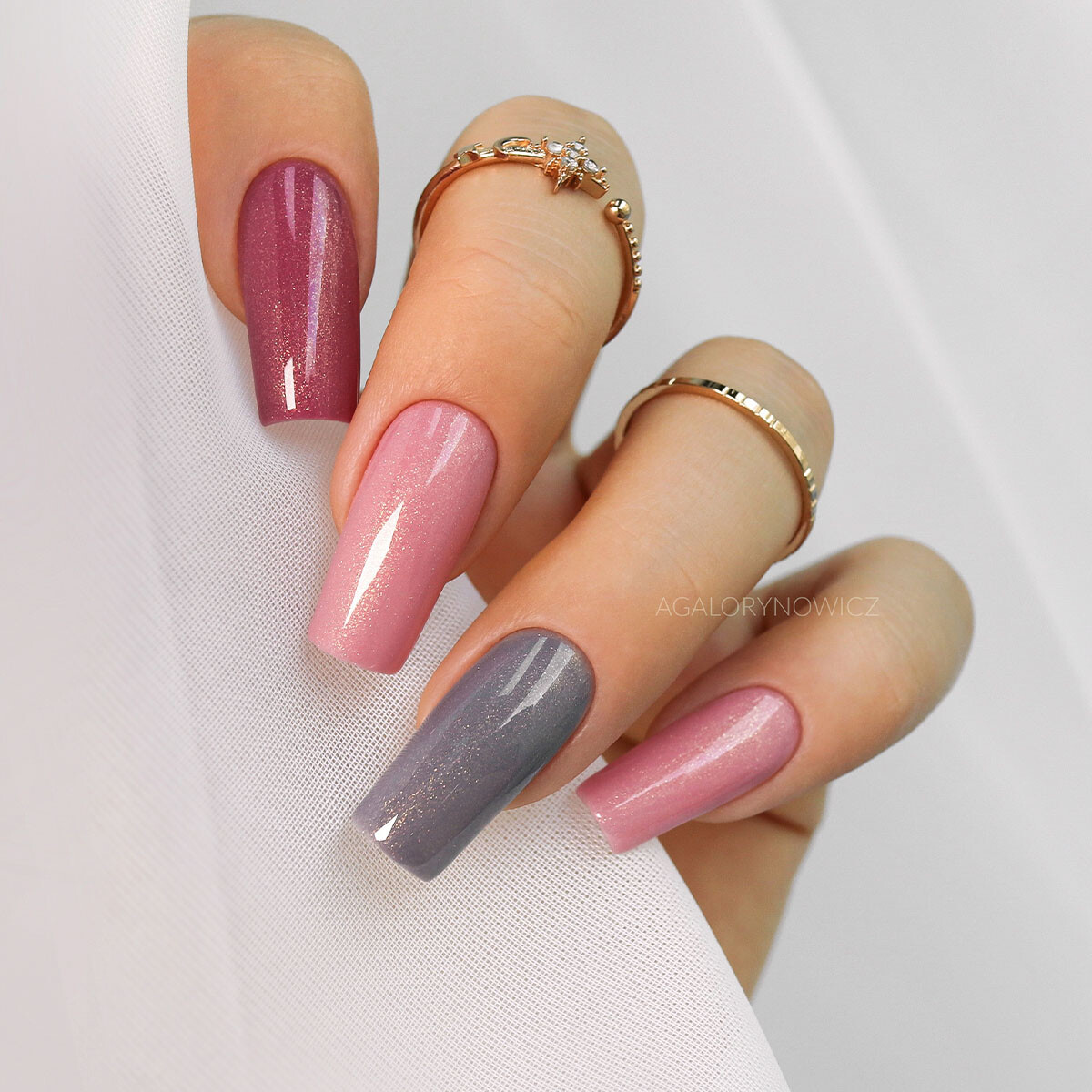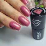 En dus rosarød gelélakk med gullglitrende partikler. En energisk og feminin nyanse med varm glød.
