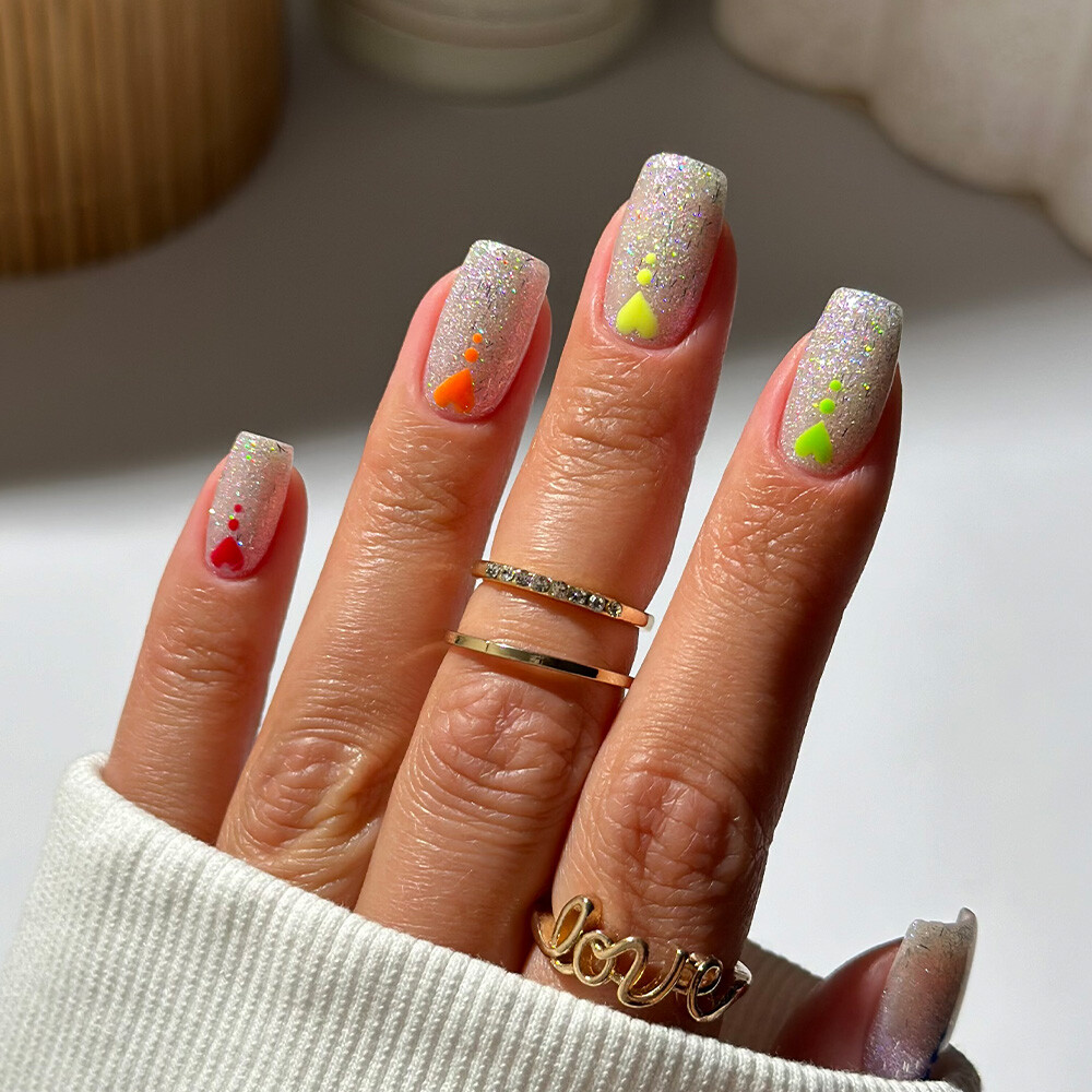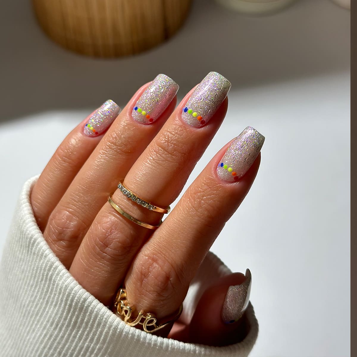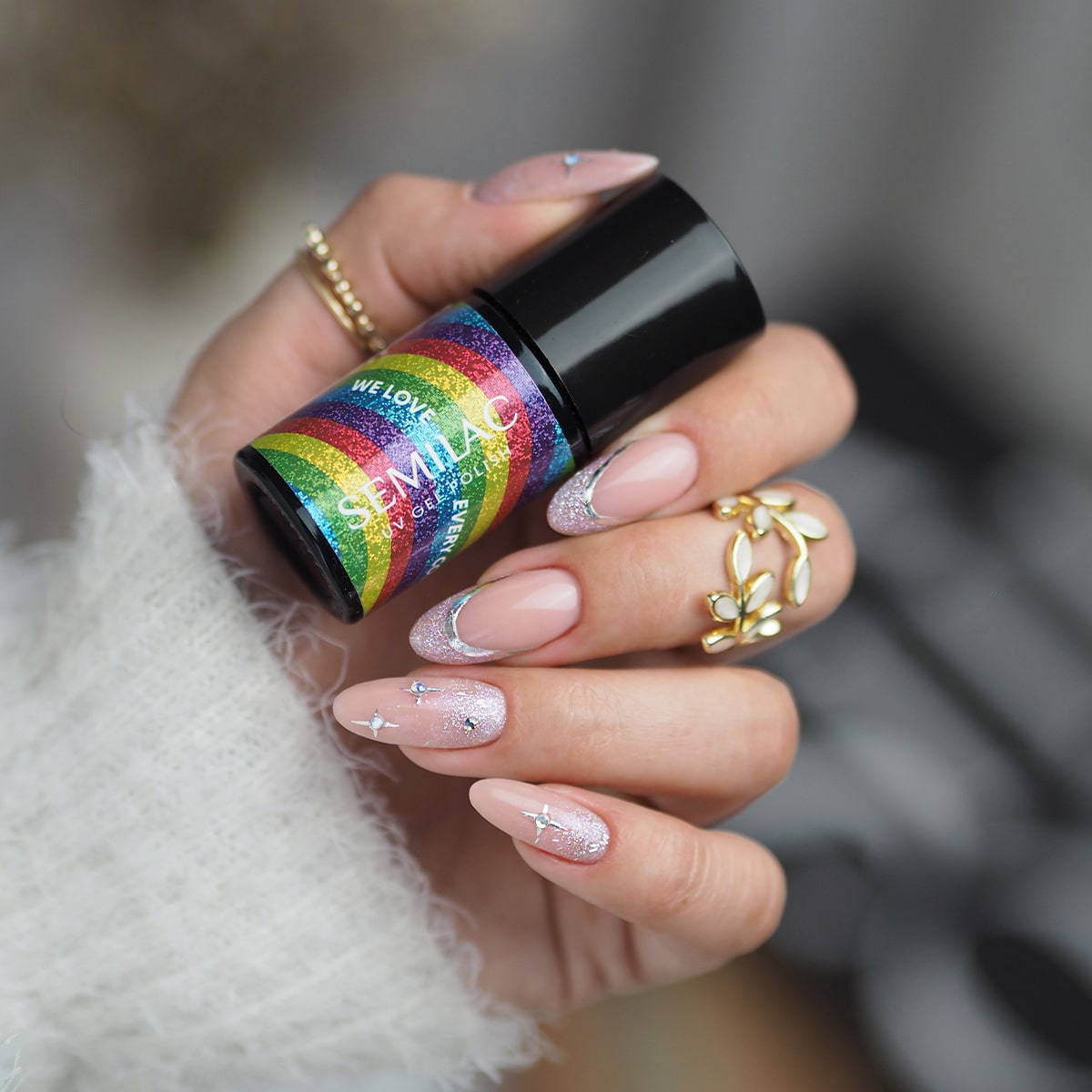 En halvgjennomsiktig sølvnyanse fylt med regnbuefarget mikroglitter og små konfettistriper som fanger lyset fra alle vinkler. En livlig, feirende farge som symboliserer stolthet, frihet og gleden ved å være seg selv.