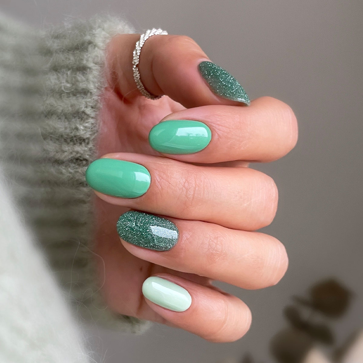 En dempet smaragdgrønn med et lett, melkeaktig preg og subtile undertoner av hvitt og grått.