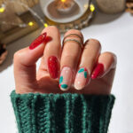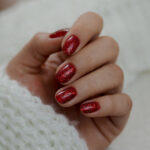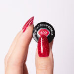 En halvgjennomsiktig rød gelélakk med varm undertone, flash-effekt og gullflak. En glødende nyanse inspirert av frostbær i vintersolen med elegant dybde og vinterinspirert shimmer.