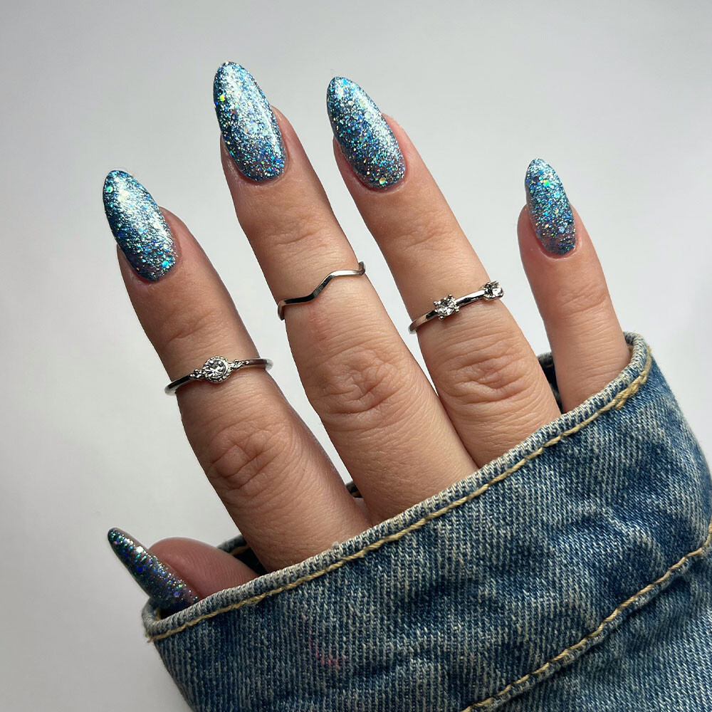 En kald blå gelélakk med holografisk glitter i ulike partikkelstørrelser. Gir en iskrystallaktig glans inspirert av glitrende julelys og snødekte landskap.