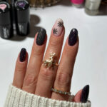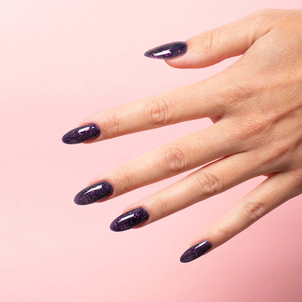 En semi-transparent sort gelélakk med flash-glitter og rosa- og grønnskimrende galaxy-flak. Gir en flerdimensjonal effekt med metallisk glød og mystiske refleksjoner.