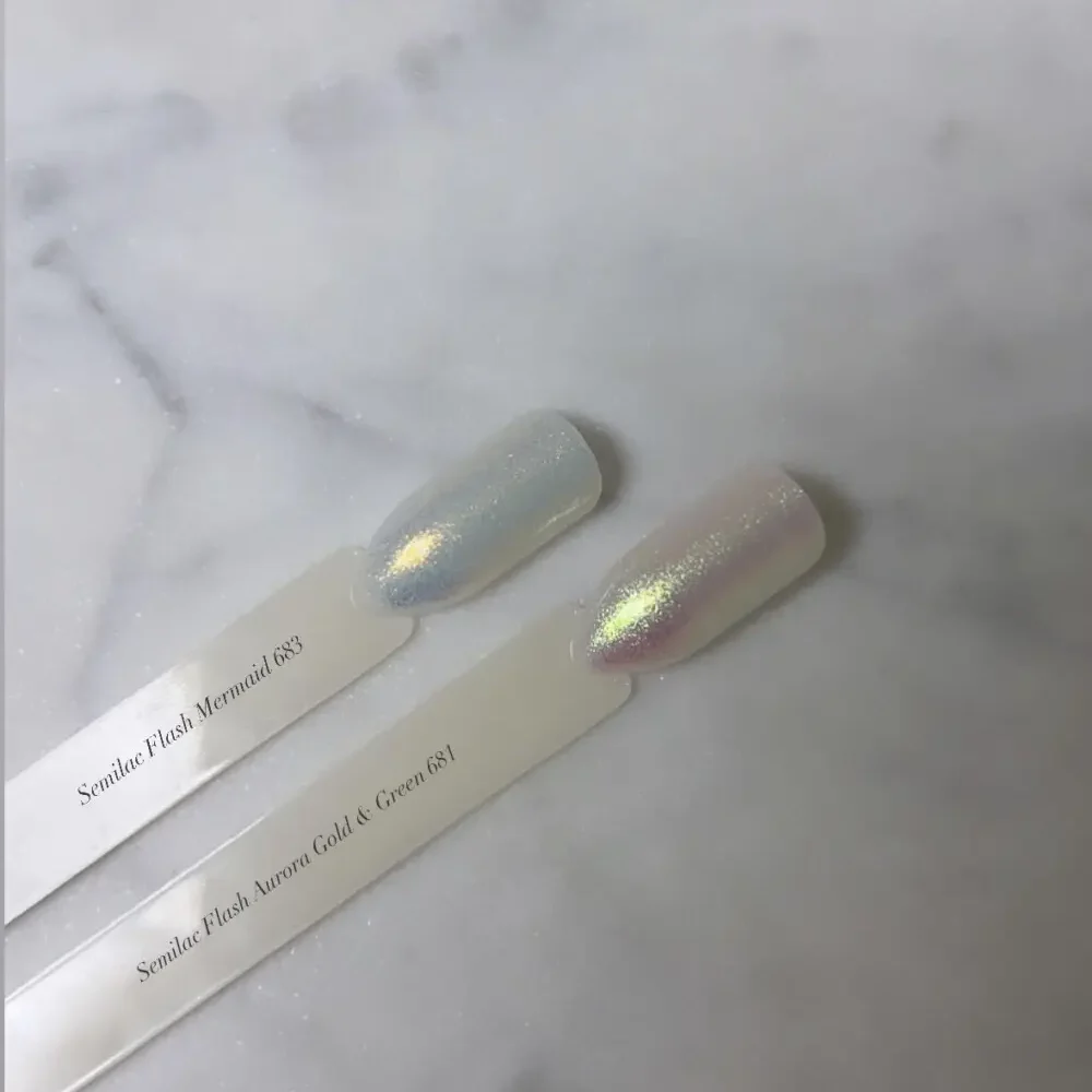Gi neglene dine en glød fra en annen dimensjon med Semilac Flash Aurora Gold & Green – et elegant og moderne pigment som gir en skimrende grønn-gull effekt. Pulveret gir en delikat, men effektfull finish som fremheves spesielt godt over en mørk base, som for eksempel Semilac Black Diamond 031. Resultatet? En glamorøs, tidløs manikyr med et aurora-inspirert preg.