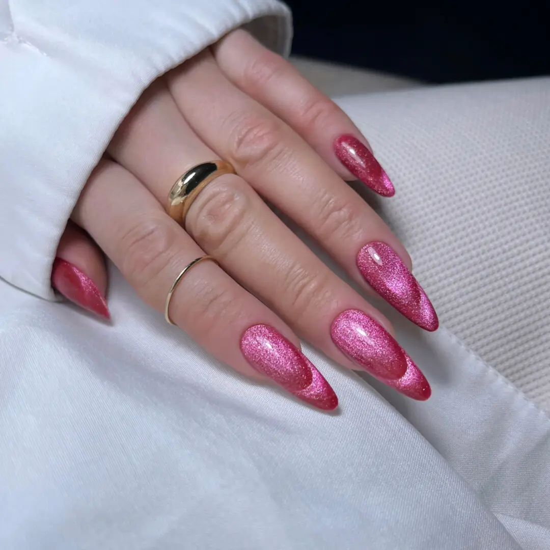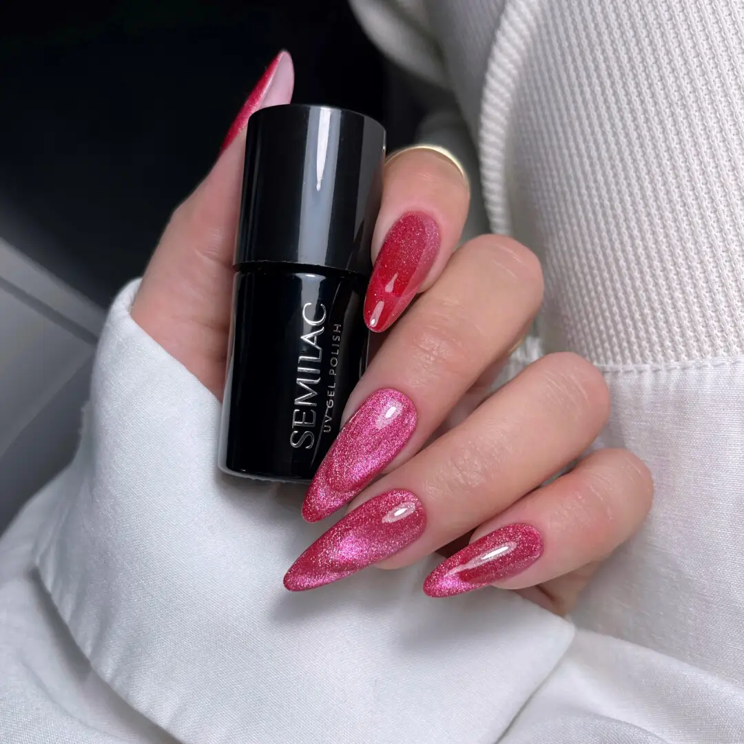 En dyp rødfarge med bringebærpreg og magnetisk cat eye-effekt. Fine reflekterende partikler skaper dybde og et tredimensjonalt uttrykk når magnet aktiveres, med et diskret flash-skimmer som fanger lyset. Resultatet er en intens og iøynefallende manikyr med tydelig dybde.