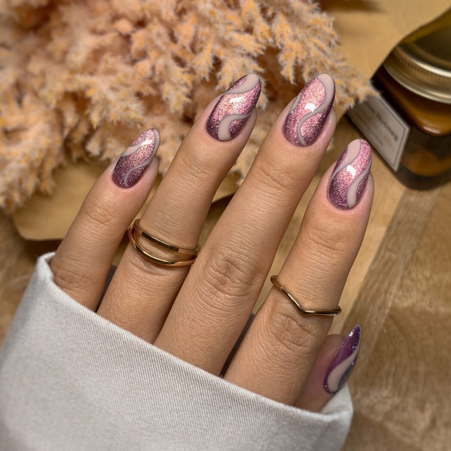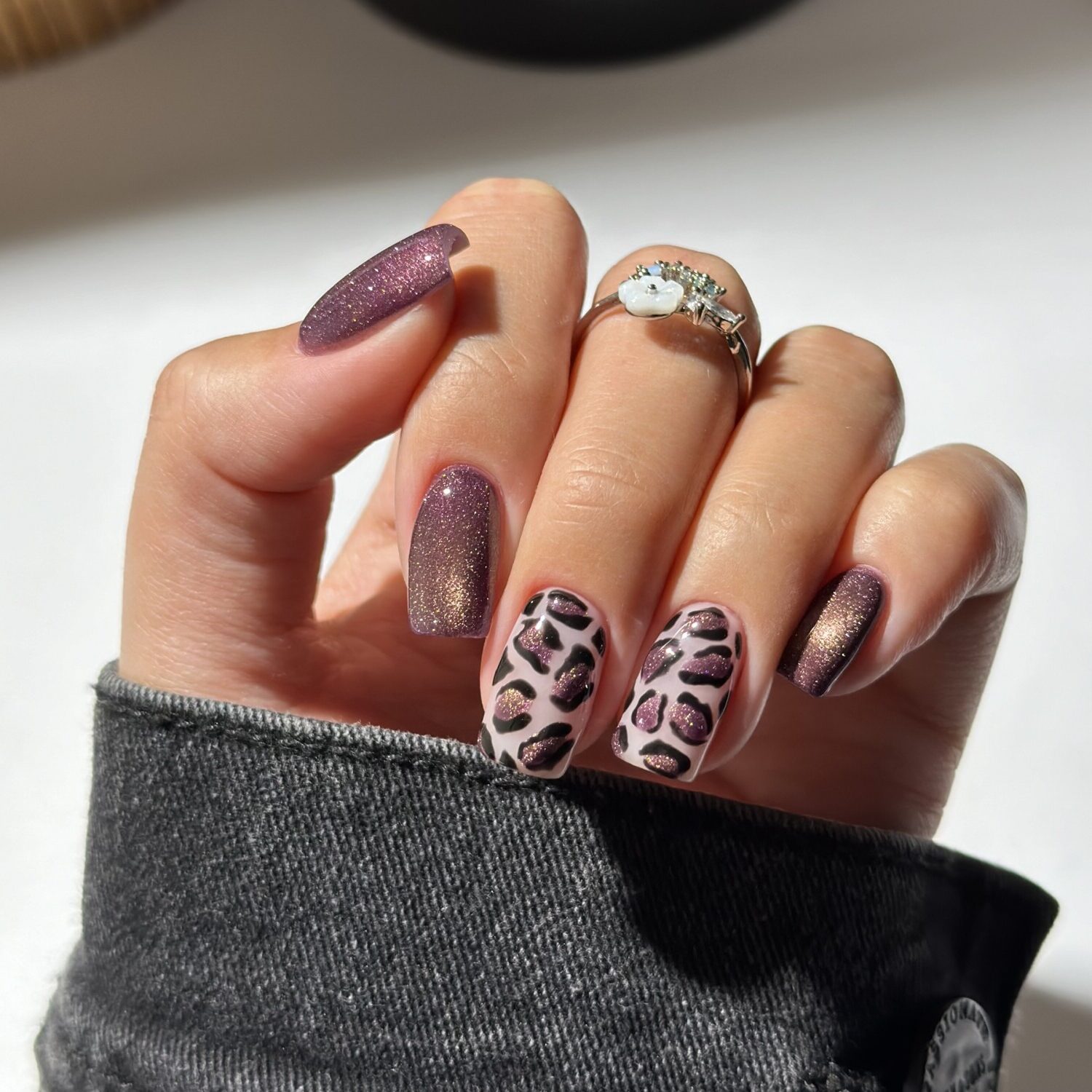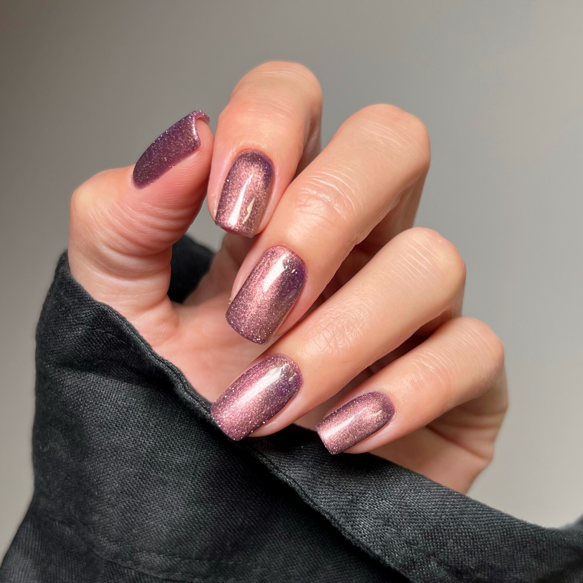 En kobber-gullskinnende nyanse med dyp lilla undertone. En magisk farge som glitrer med holografiske reflekser, som stjerner på nattehimmelen.