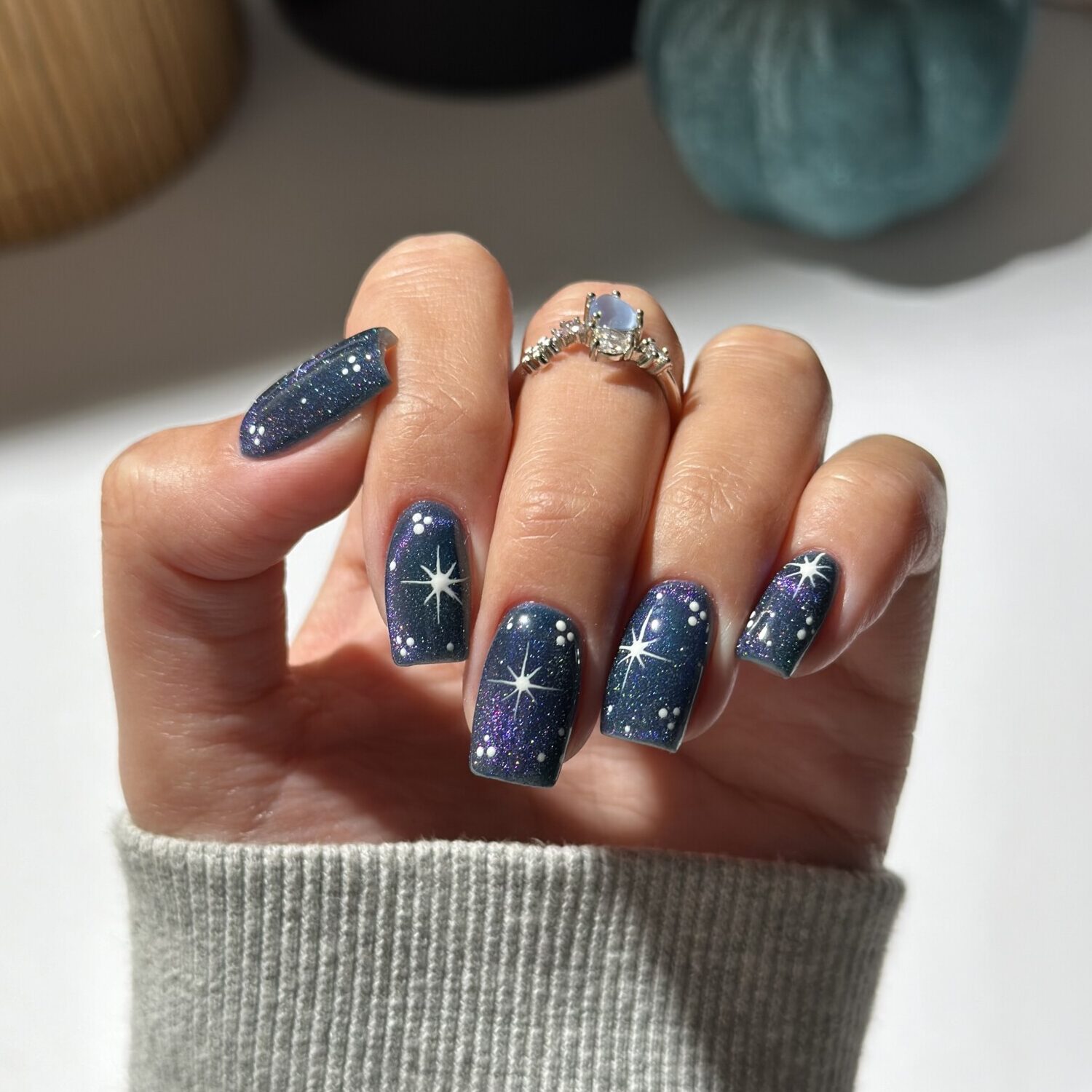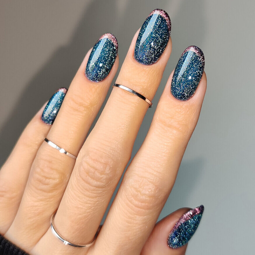 En havblå base med fiolett-rosa shimmer. En hypnotiserende farge med dybde og holografiske lysreflekser.