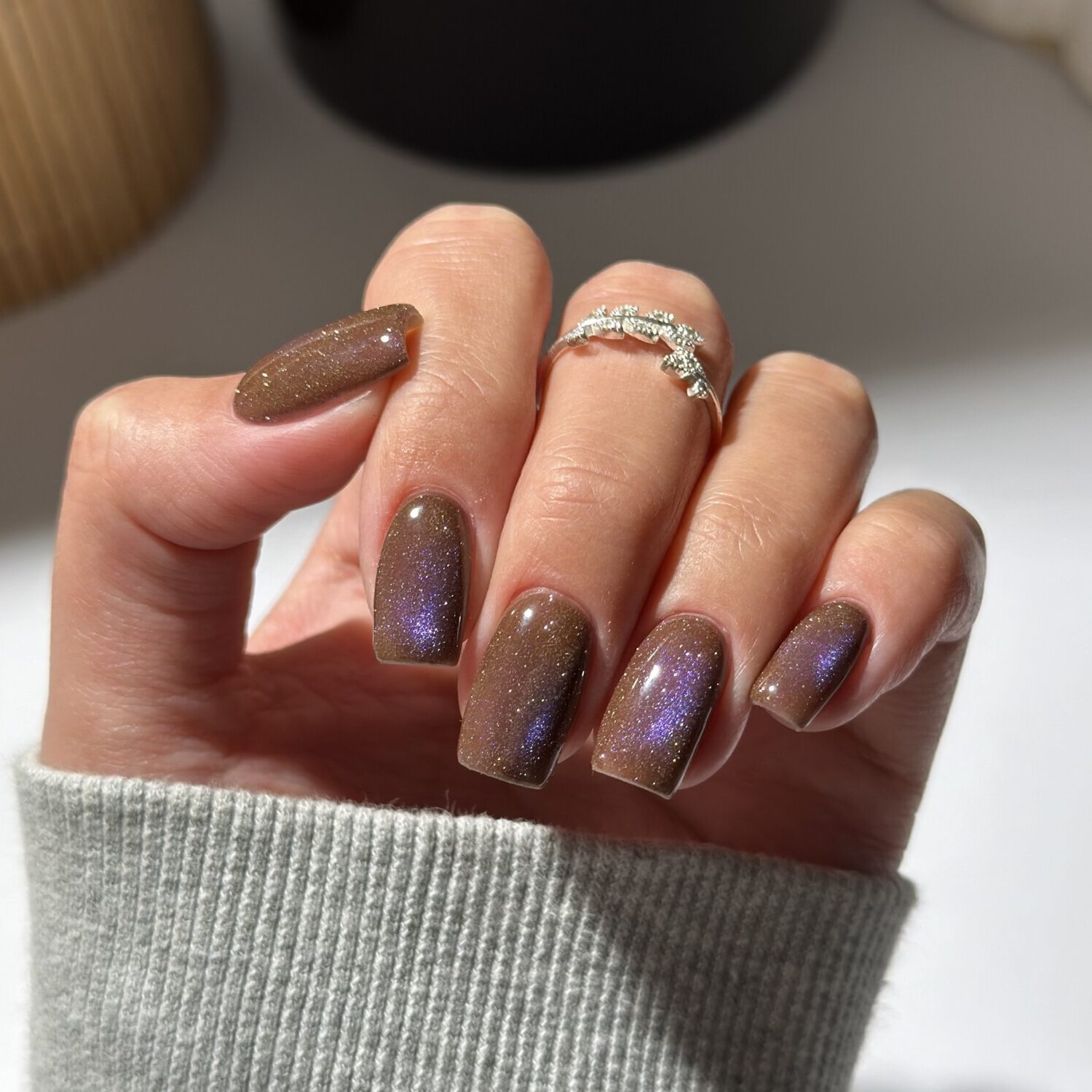 En sjokoladebrun base med kobberfiolett shimmer. En sofistikert og gåtefull nyanse med et kosmisk preg.