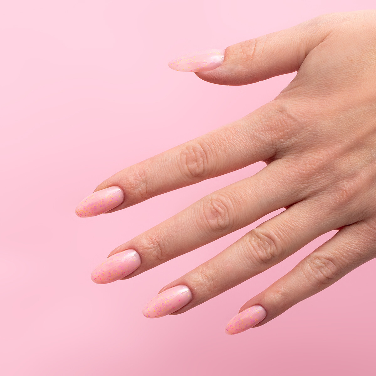 En pastellrosa fylt med små neonpartikler i oransje, lilla og rosa. Søt, livlig og full av vårstemning – som en frisk miks av sukkertøy og sollys på neglene.