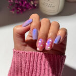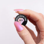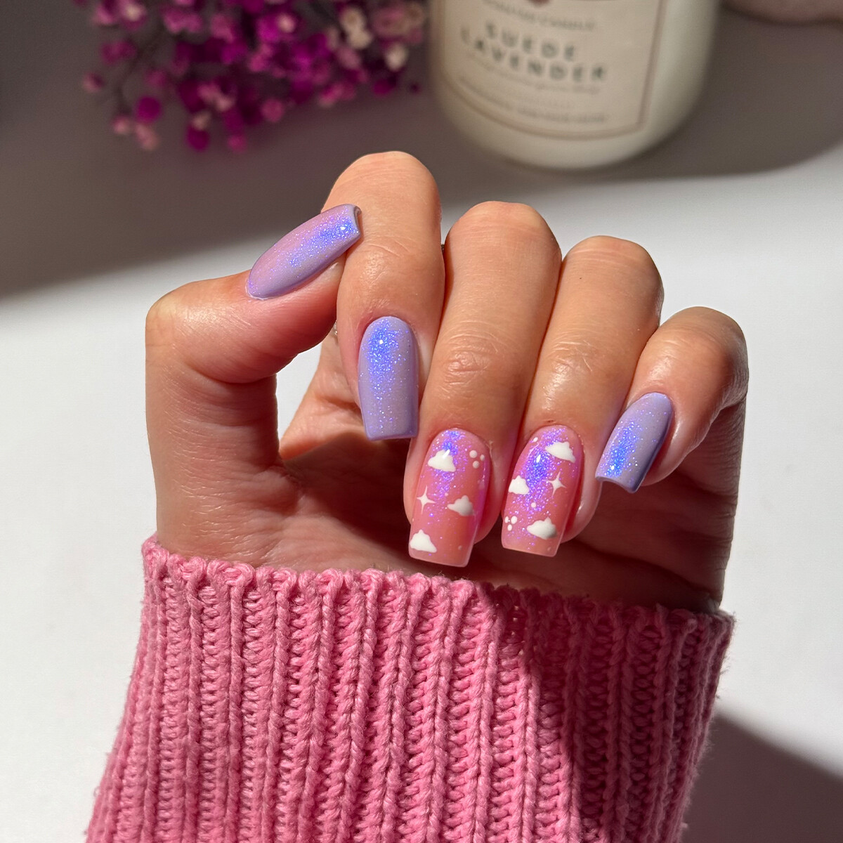En halvgjennomsiktig rosa base med blåfiolett perlemorsstøv. Gir neglene en moderne Glazed Nails-effekt med et mykt, skimrende lag som passer til enhver pastellkombinasjon.