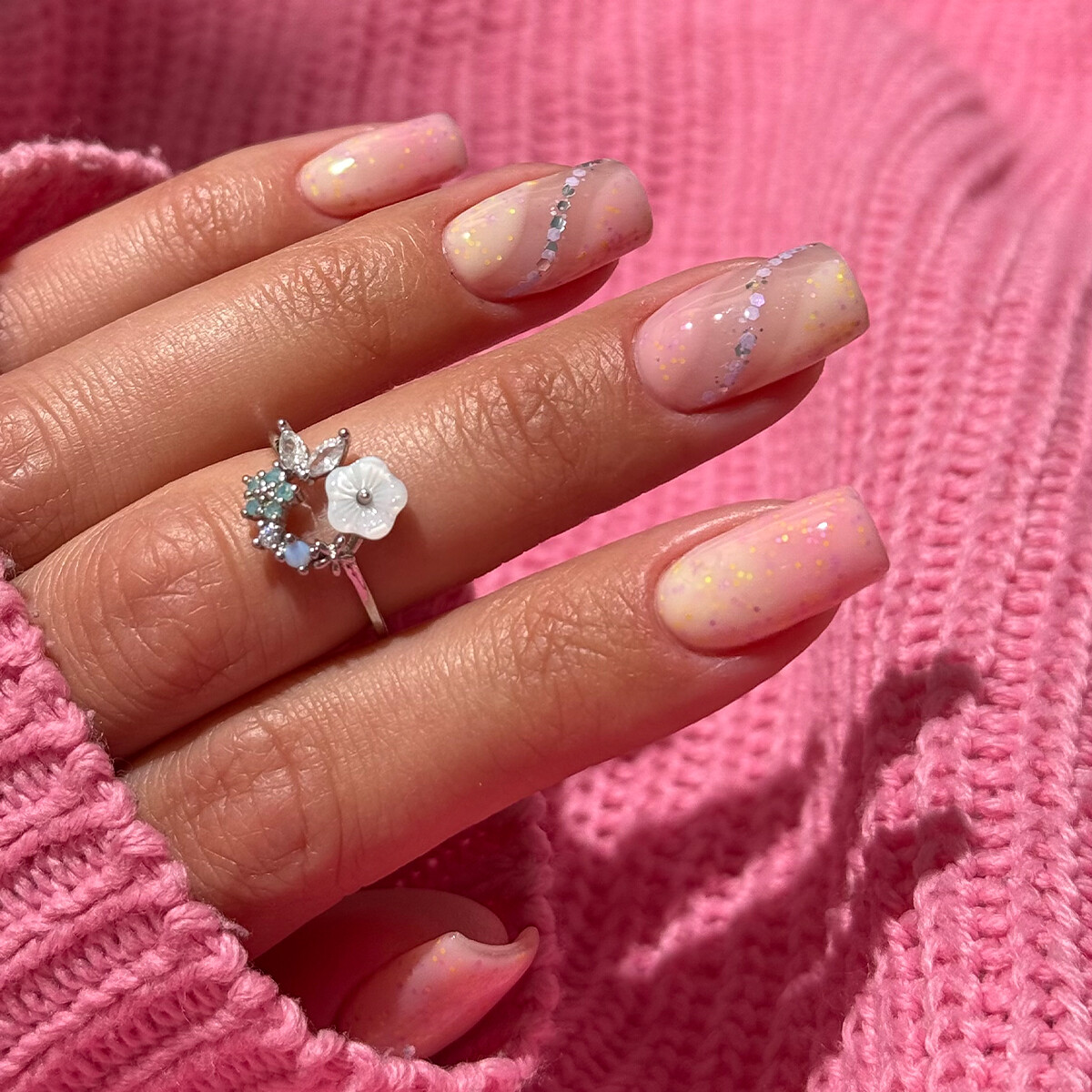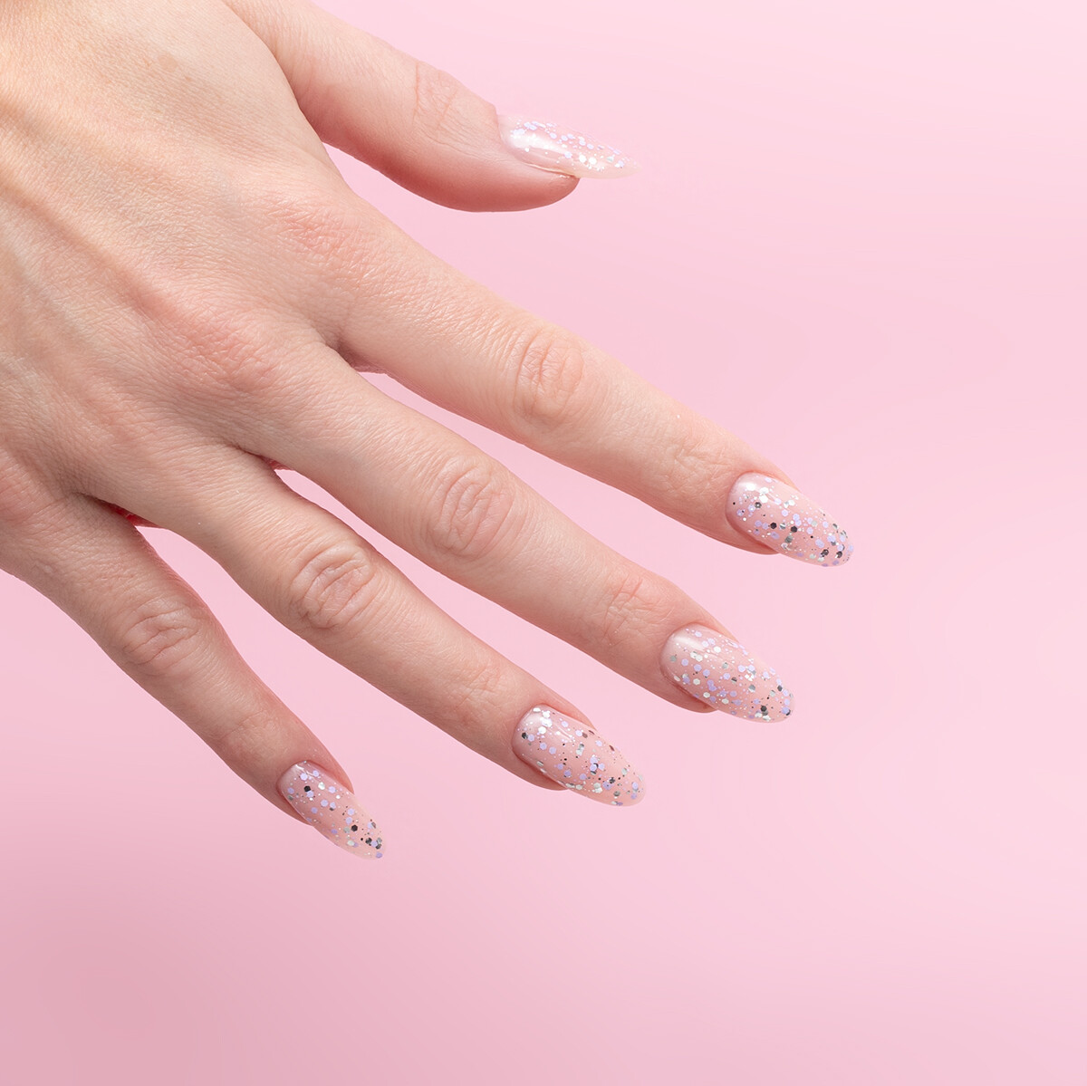 En transparent lakk med delikate partikler i sølv og pastellfiolett. Gir neglene et juvellignende skimmer – perfekt alene eller som en glamorøs topping i Queen Nails-stilen.