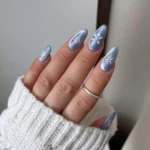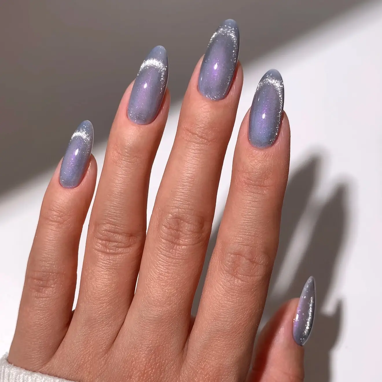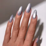 En delikat, lys isblå gelélakk med iriserende fiolett perlemor-skimmer som gir et frostaktig uttrykk inspirert av vinterlys og iskrystaller, med en glitrende, glasslignende finish.