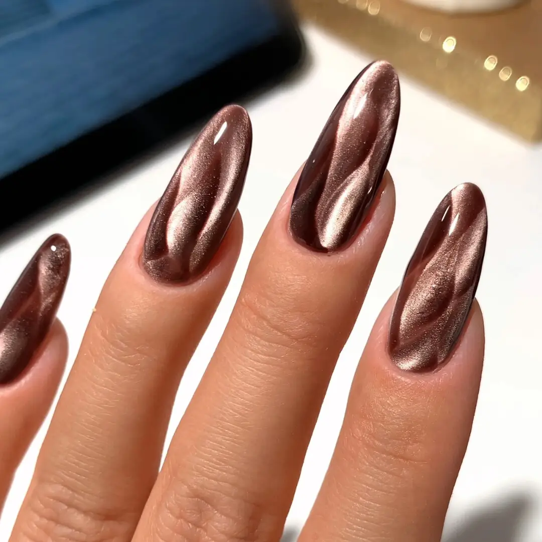 Dyp, kjølig brun med myk magnetisk glans. En sofistikert sjokoladefarge med fløyelsaktig finish og rolig dybde.