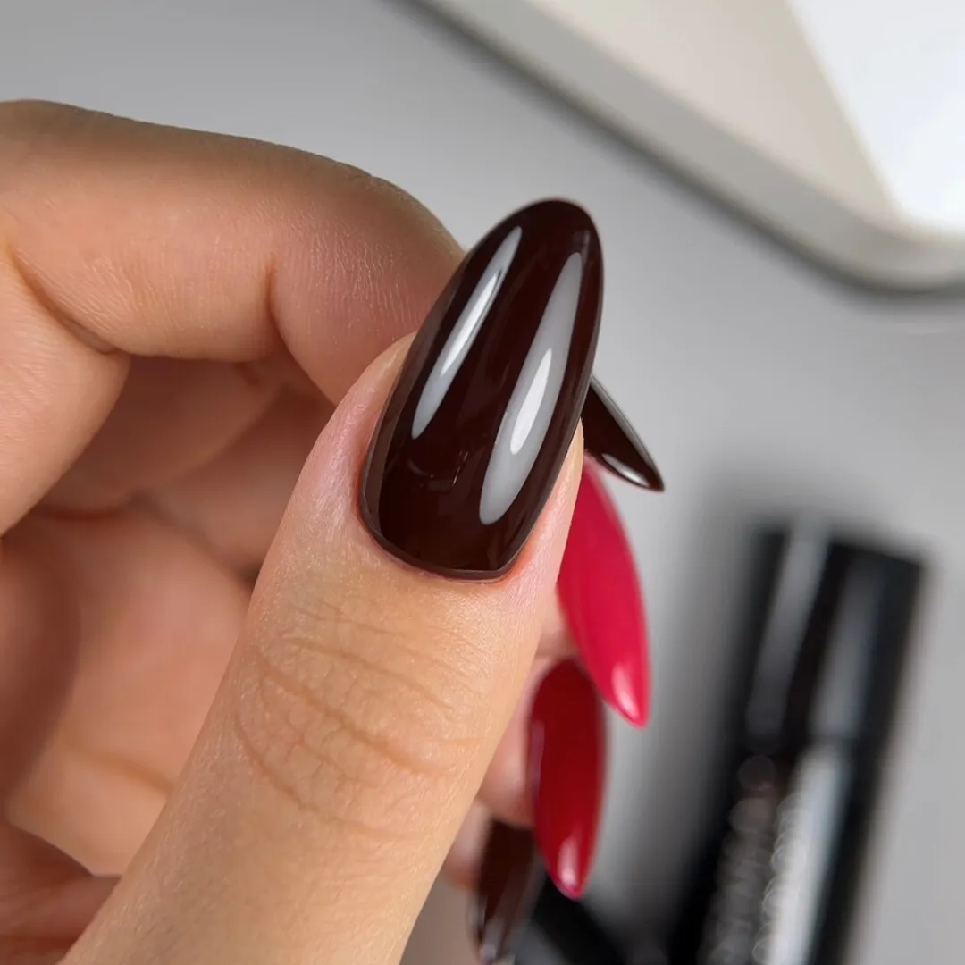 En svært dyp burgunderbrun nyanse som nesten fremstår sort i enkelte lys. Fargen har et fløyelsmykt uttrykk og gir et sofistikert, eksklusivt preg. Perfekt når du ønsker en mørk og elegant manikyr med tydelig dybde.