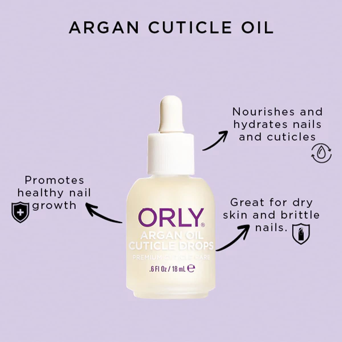 ORLY Argan Oil Cuticle Drops er en premium behandling for tørre og sprø negler og neglebånd. Den rike formelen kombinerer arganolje, jojobaolje og vitamin E for å tilføre fuktighet, næring og antioksidantbeskyttelse.