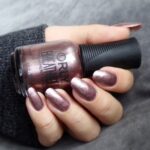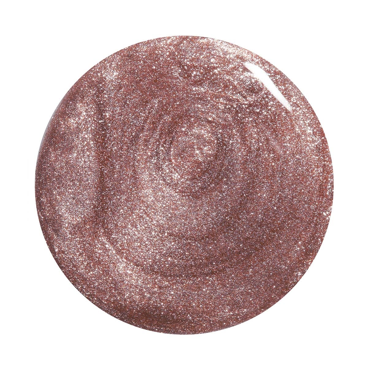 En roségull neglelakk med shimmer og innslag av brunt, gull og mauve – varm, glitrende og elegant.