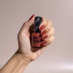 En varm terrakotta neglelakk med innslag av brun, nude og rød – myk og jordnær.
