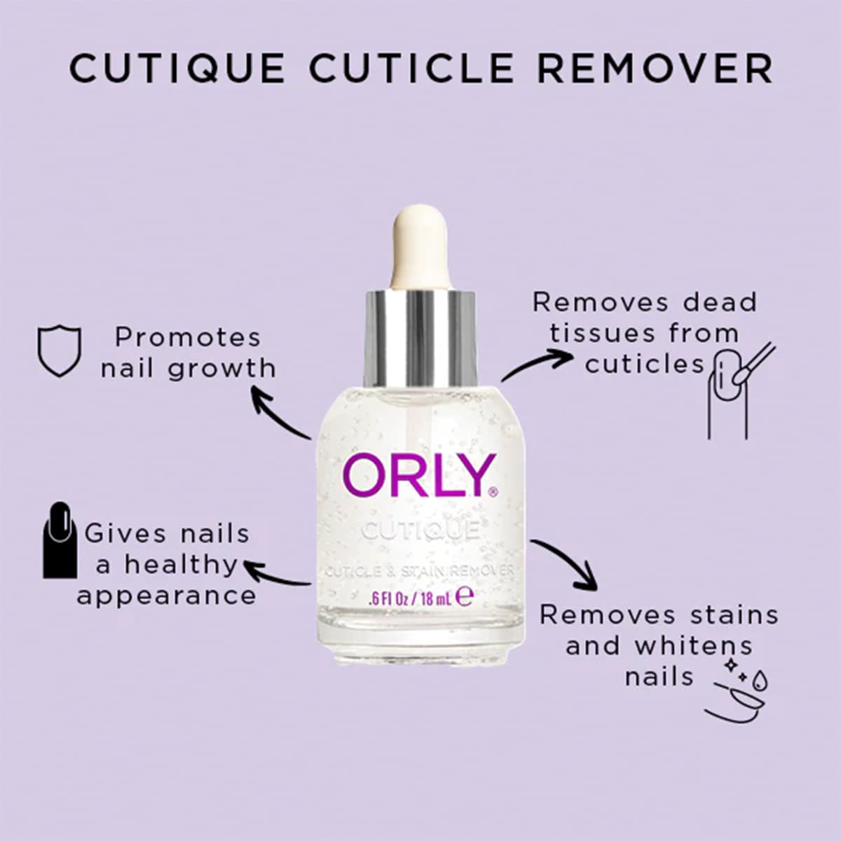 ORLY Cutique er en neglebånds- og flekkfjerner som bidrar til sunnere negler ved å skånsomt fjerne dødt hudvev og misfarging. Den gjør neglebåndene myke og smidige, samtidig som den lysner og fjerner flekker for et renere og hvitere utseende på neglene.