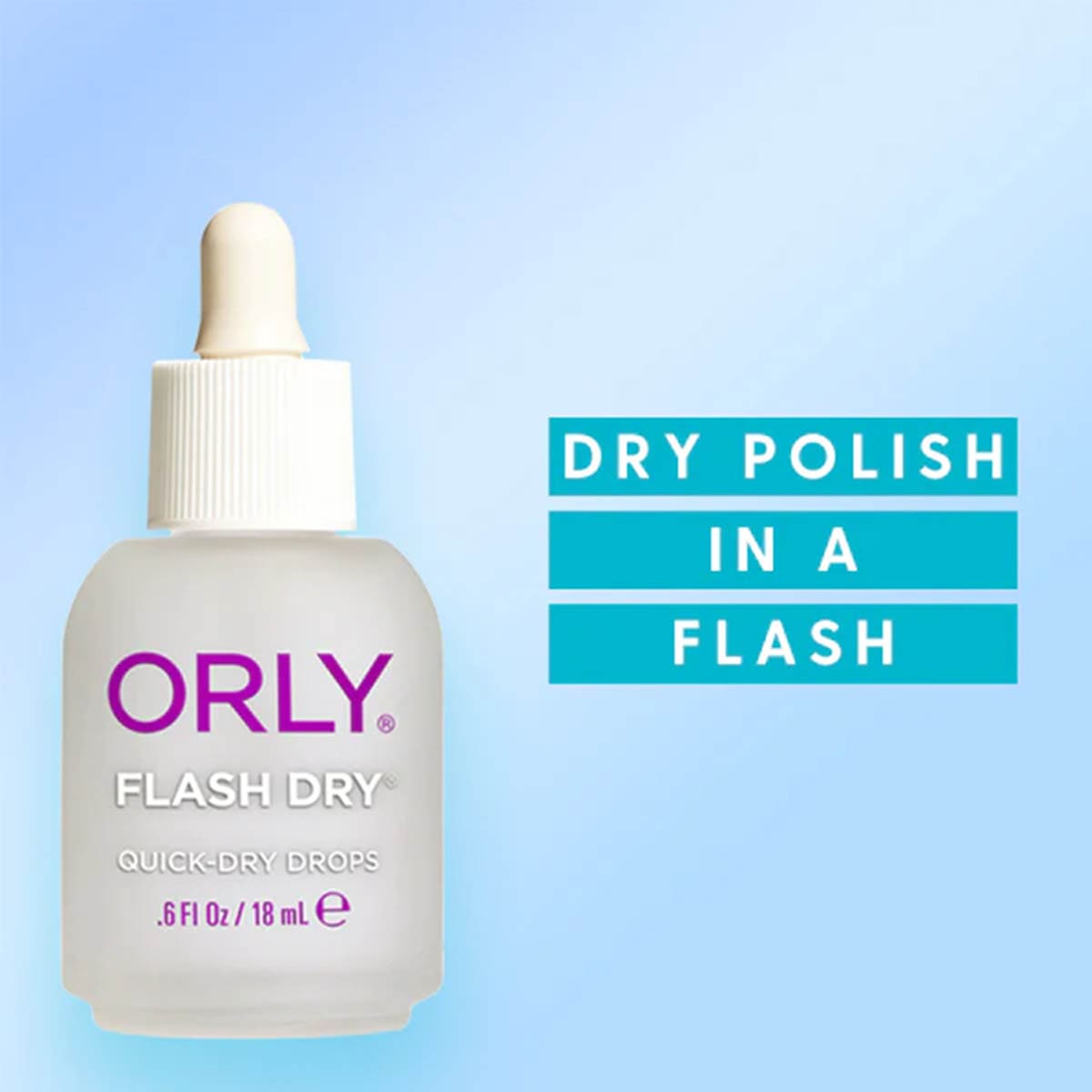 ORLY Flash Dry er hurtigtørkende shine drops som gjør at nylagt neglelakk tørker raskere, samtidig som de tilfører en glansfull finish. Formelen hjelper til å forhindre riper og merker i lakken rett etter påføring, og gir et plettfritt sluttresultat på både manikyr og pedikyr.