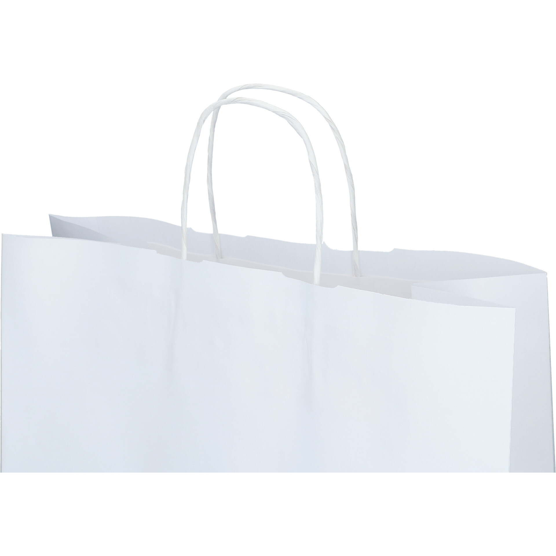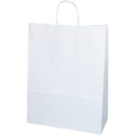 Hvit papirpose med tvinnede hvite håndtak, laget av hvitt kraftpapir.