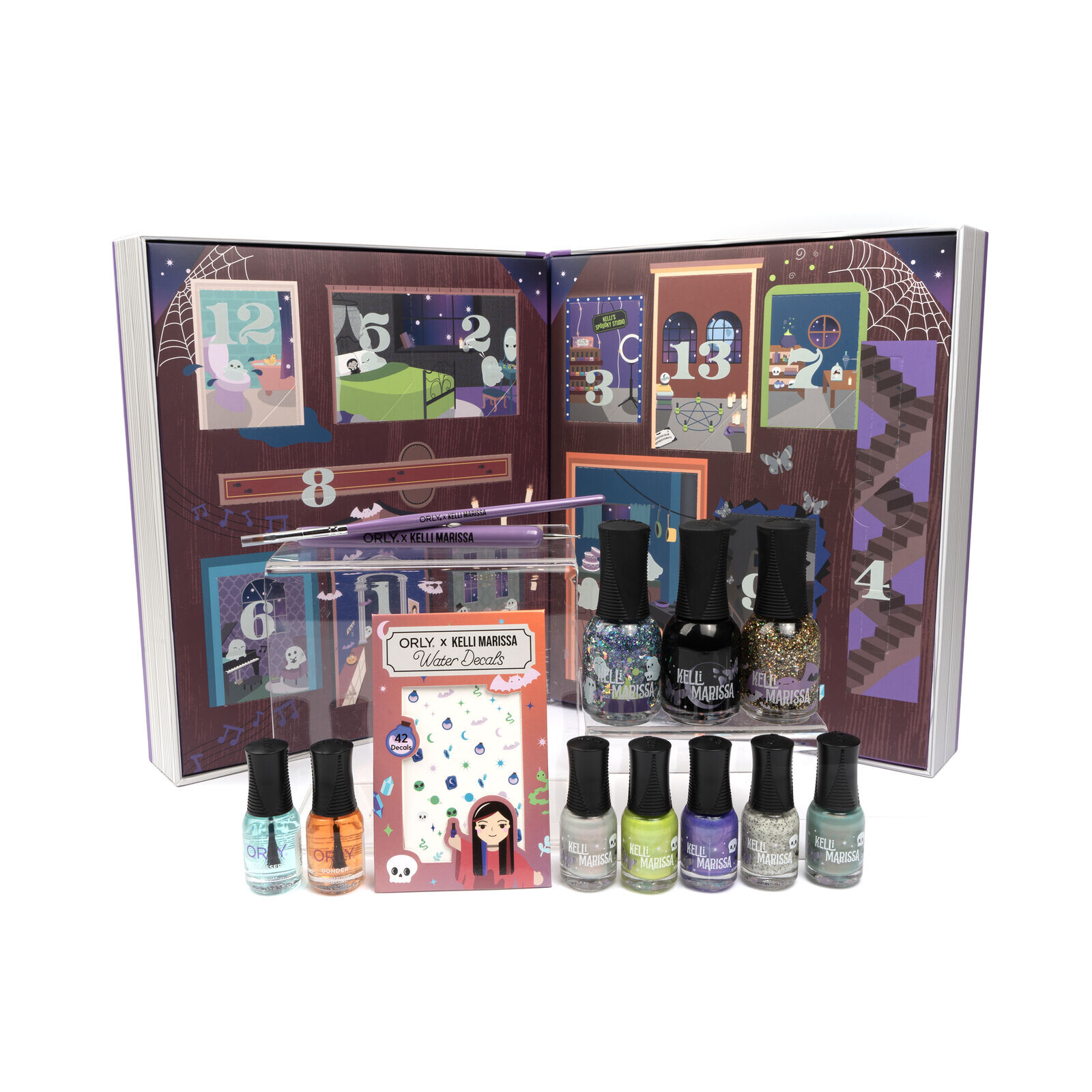 Kelli’s Haunted House kalenderen består av 13 luker med unike produkter til dine negler. Her finner du blant annet tre helt nye neglelakk farger skapt av Kelli, i full størrelse. I tillegg finner du fem av hennes ORLY-favoritter i mini størrelser, med hennes helt egen vri.