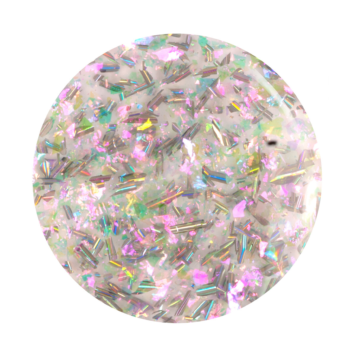 En multifarget, iriserende topper med små glitrende partikler og sølvskimrende glans som reflekterer lyset som en diskokule. Gir en livlig, knust-glass-effekt og en festlig finish som fanger blikket.