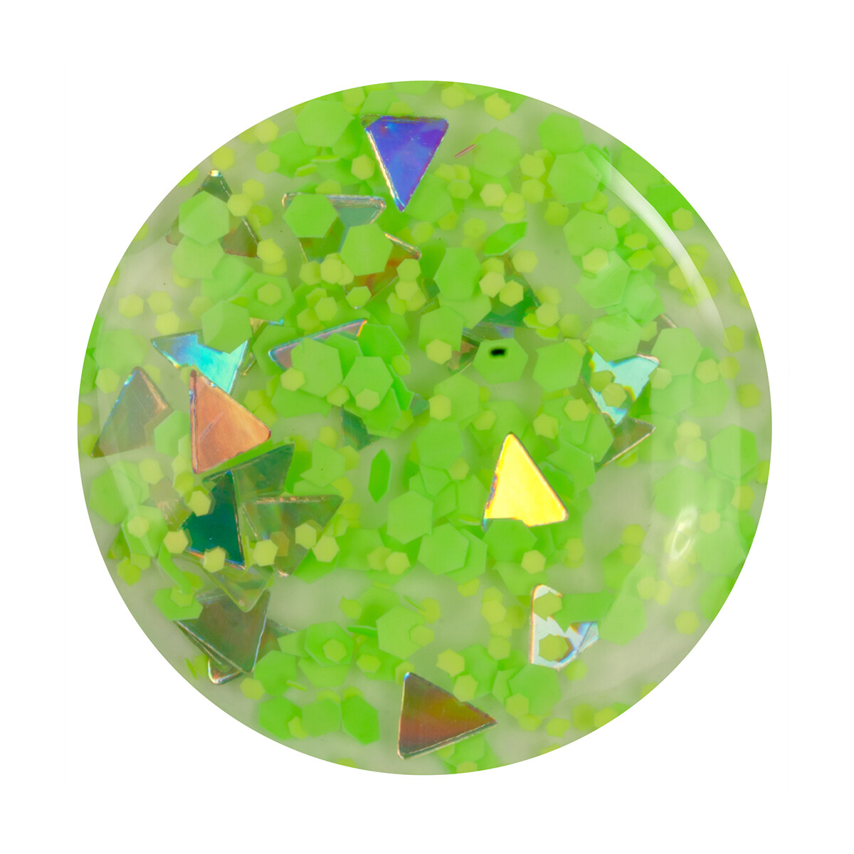 En livlig neon-grønn topper med holografiske trekantglitter som gir en iøynefallende, lysreflekterende finish som løfter enhver manikyr.