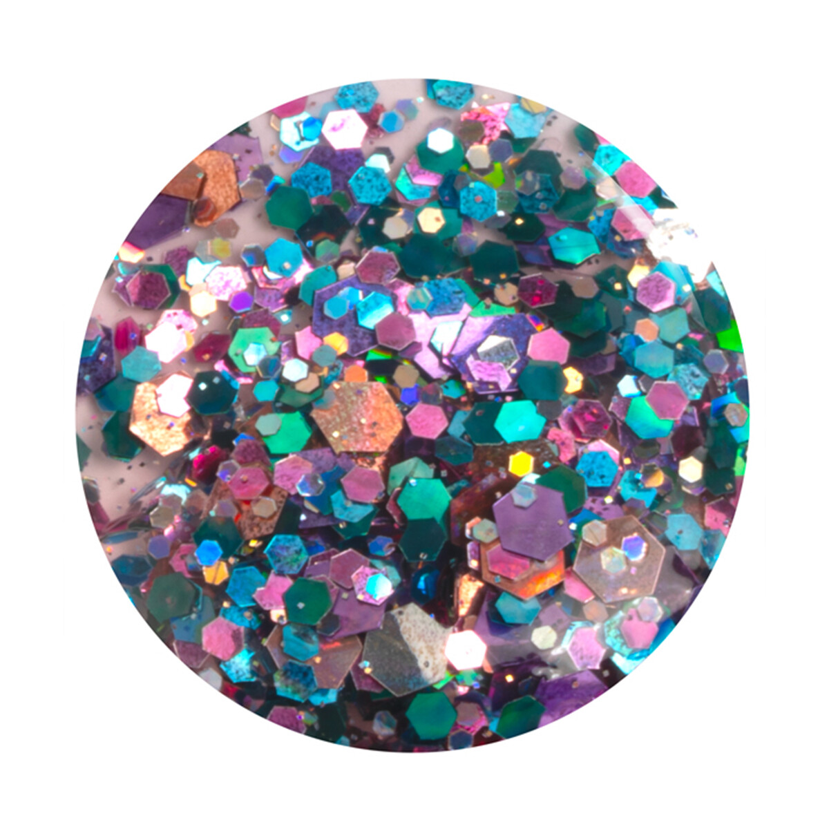 En metallisk glitter-topper med flerdimensjonalt skimmer av teal, rosa og sølv som gir en fascinerende glans og fortryllende dybde over enhver basefarge.