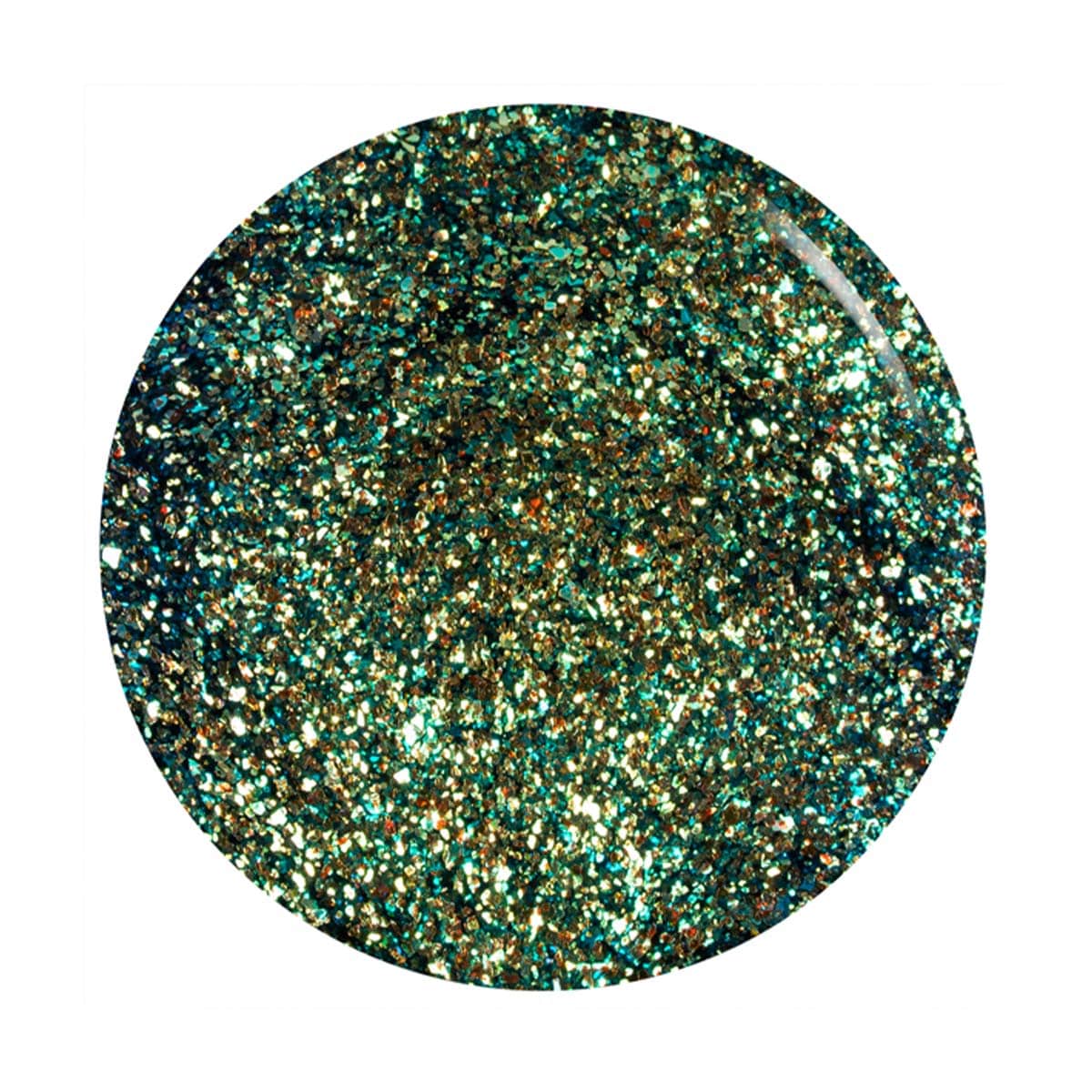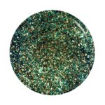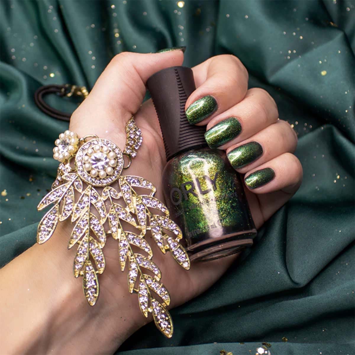 En glitrende smaragdgrønn neglelakk med gyllen glød og juvellignende finish.