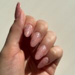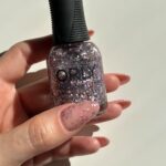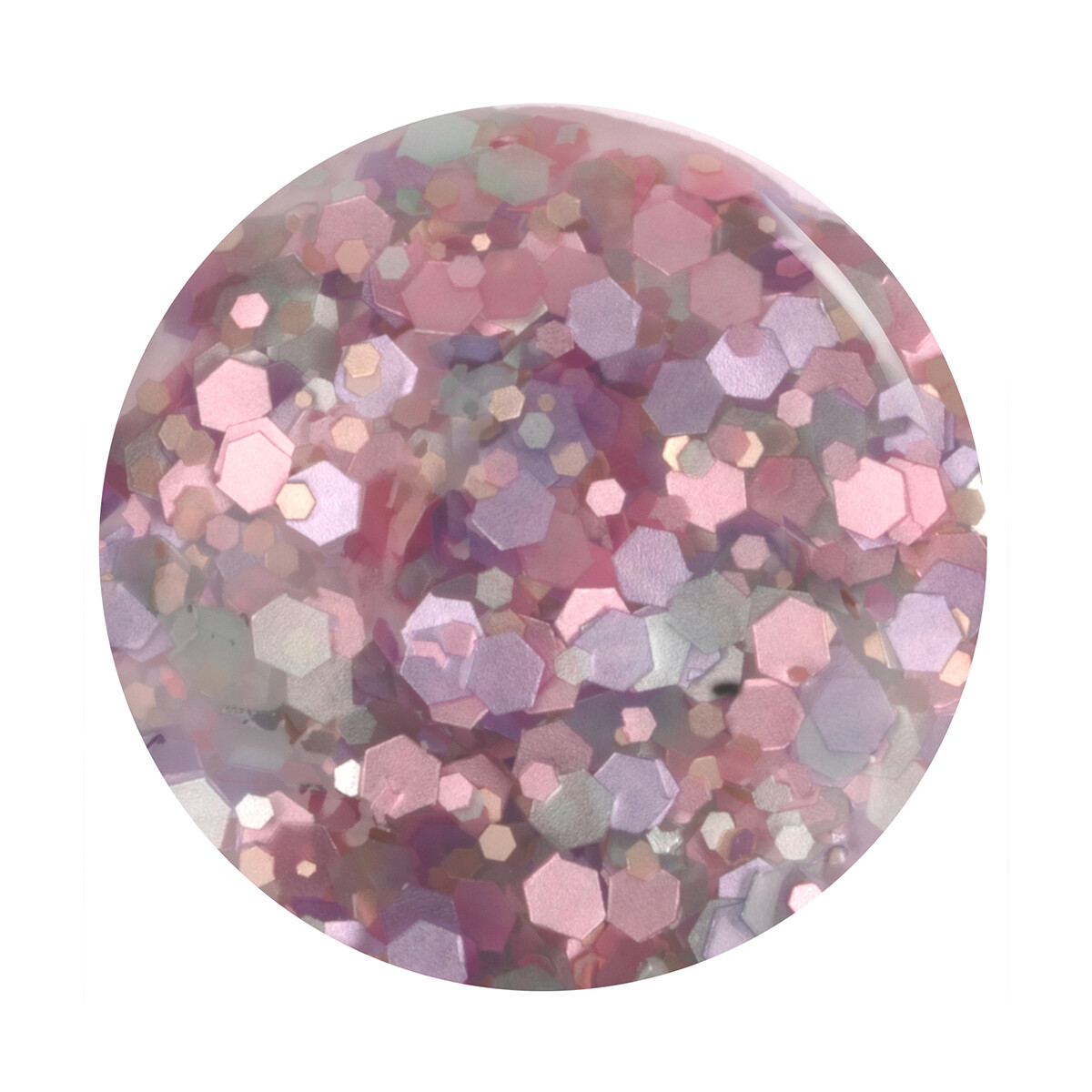 En pastellrosa neglelakk-topper med iriserende perleglitter som gir en elegant og skimrende finish med myk dybde.