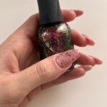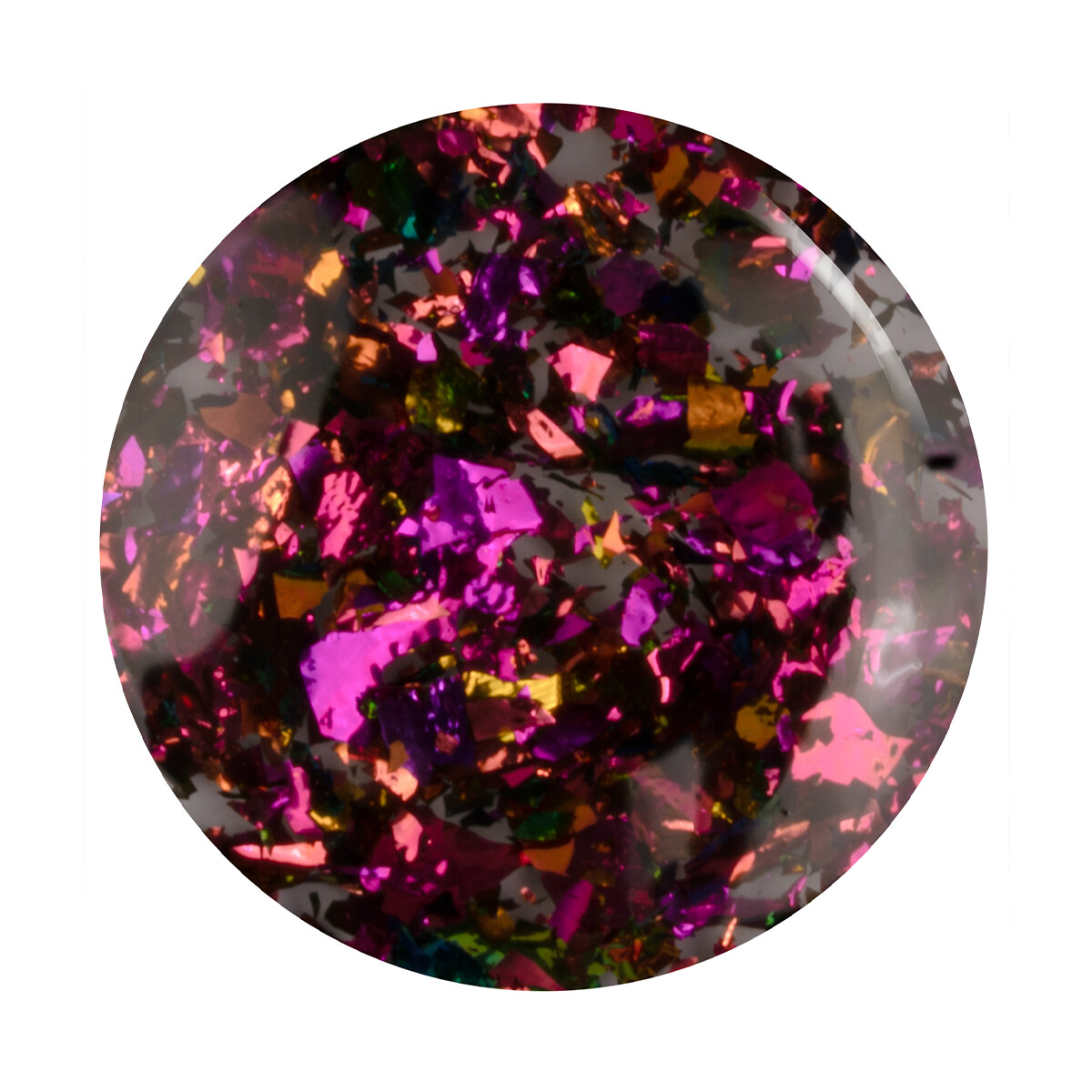 En multi-chrome neglelakk-topper med knust-glass-effekt i grønne og lilla toner som gir et magisk fargespill og glødende skimmer.