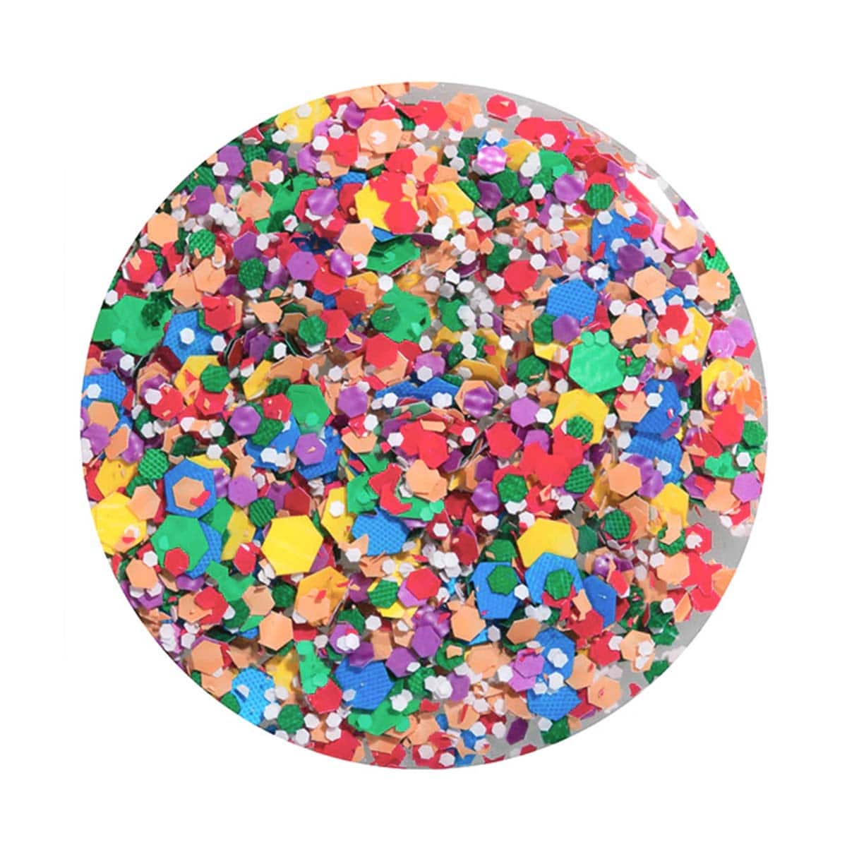 En livlig konfetti-lakk med fargerike partikler i blått, grønt, oransje, rosa, lilla, hvitt og gult – en leken og festlig finish som sprer glede på neglene.