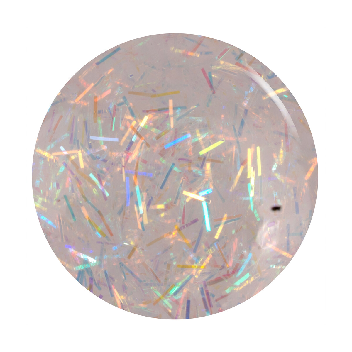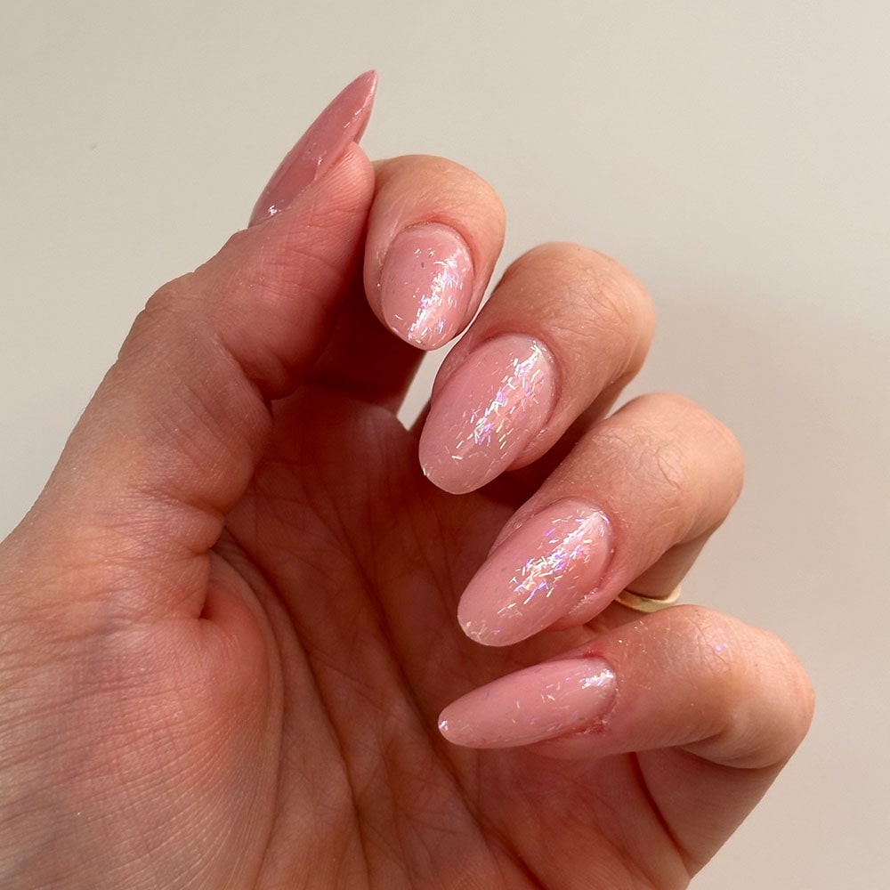 En transparent, flerfarget topper med iriserende stråglitter som gir en skimrende, stjerneliknende effekt – som et slør av glitrende lys over neglene.
