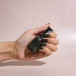 En dyp grønn neglelakk med subtile svarte og grå undertoner – sofistikert, mørk og perfekt for et elegant uttrykk.