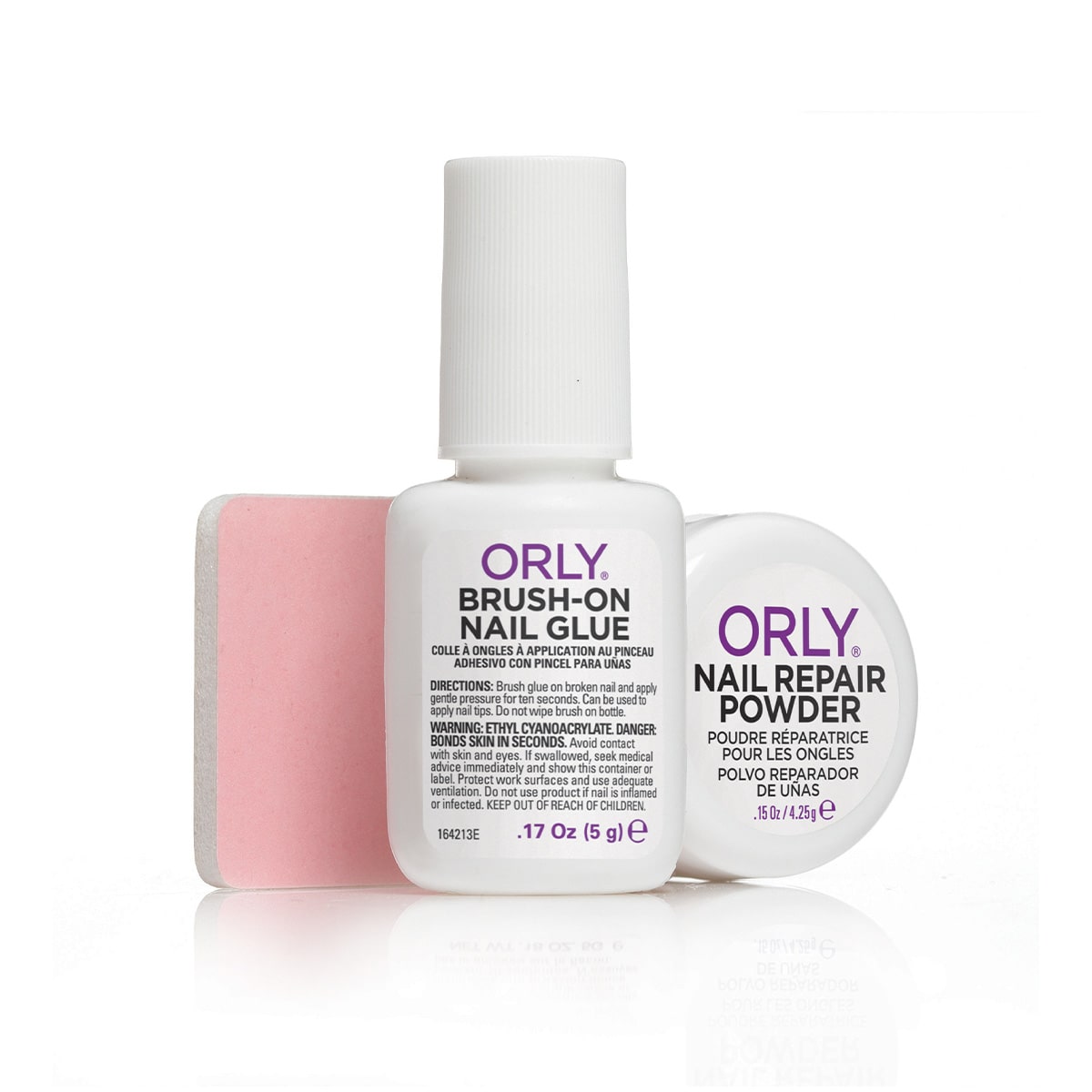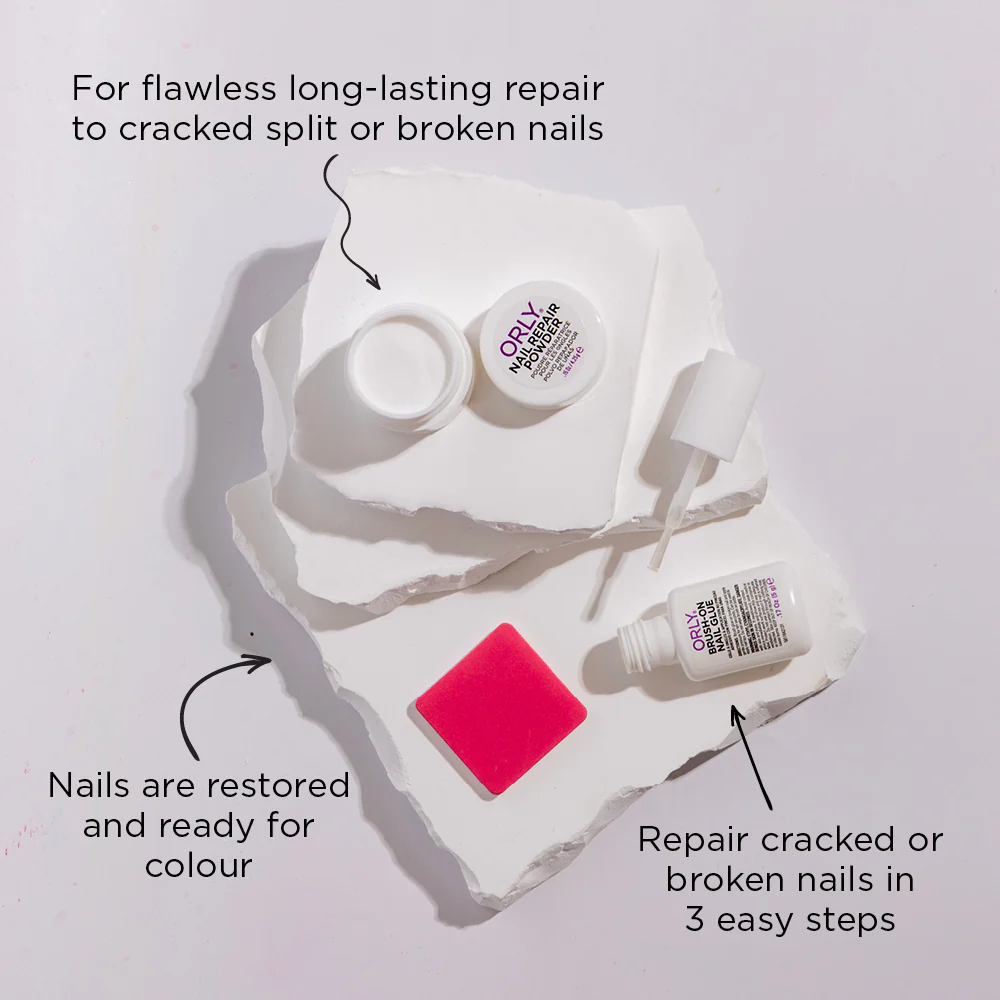 Kitet inneholder Brush-On Nail Glue, Nail Repair Powder og en Mini Buffer, som sammen gjenoppbygger neglen og gir en jevn overflate klar til lakk.
