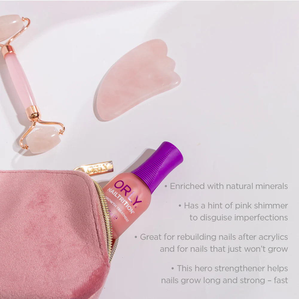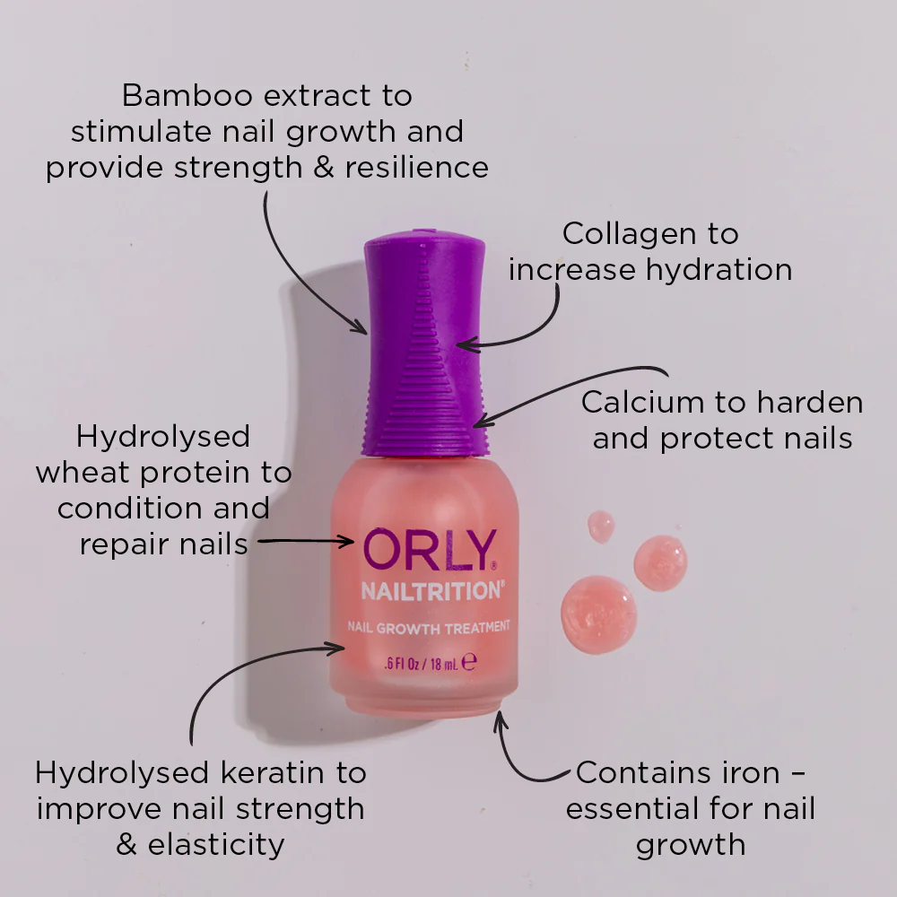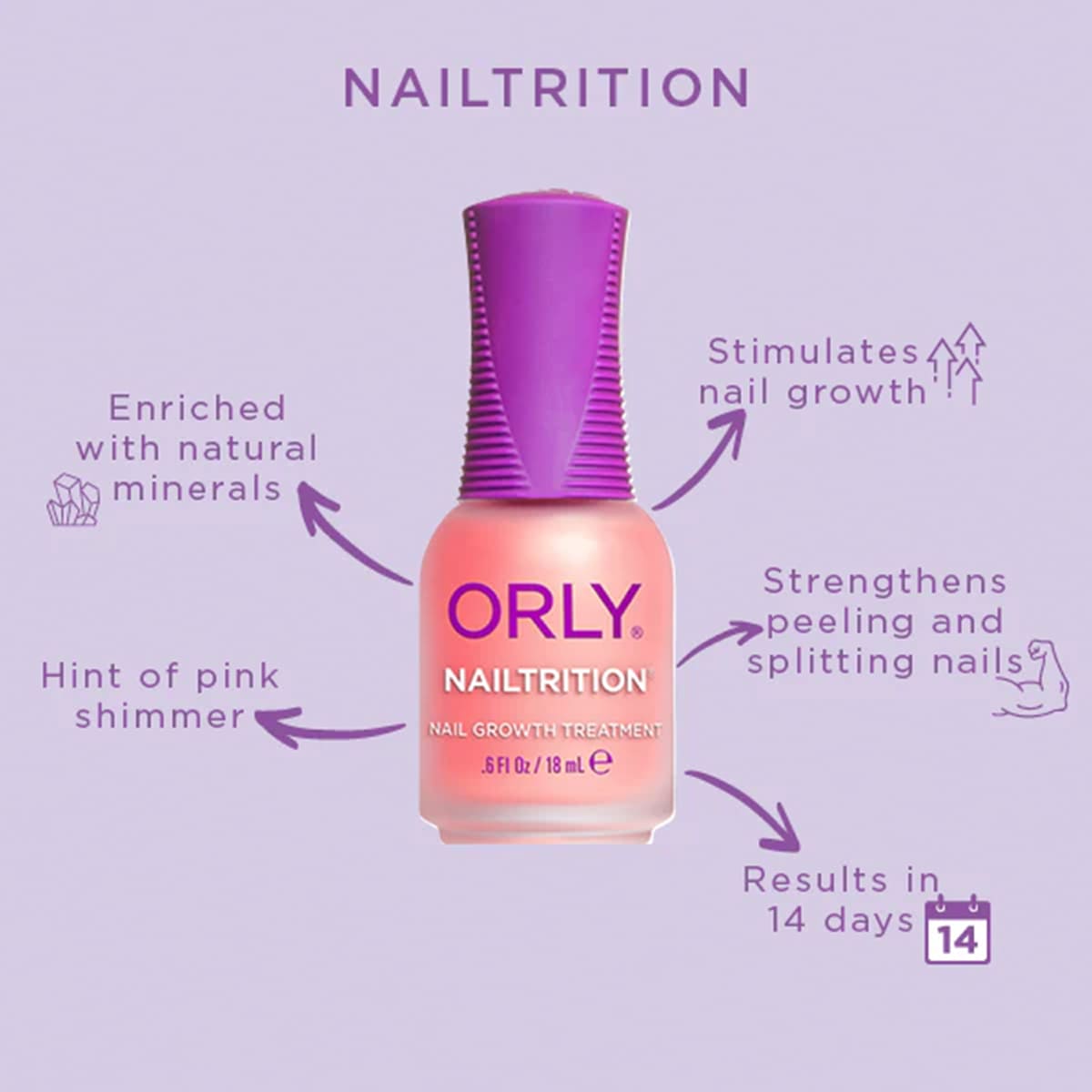 ORLY Nailtrition er en intensiv neglekur laget for å styrke, reparere og fremme vekst av svake eller skadde negler. Formelen er utviklet spesielt for negler som fliser, sprekker eller har blitt tynne etter bruk av gelé eller akryl. Med regelmessig bruk bidrar behandlingen til å stimulere en sunnere og raskere neglevekst, samtidig som den styrker og gjør neglene mer motstandsdyktige.