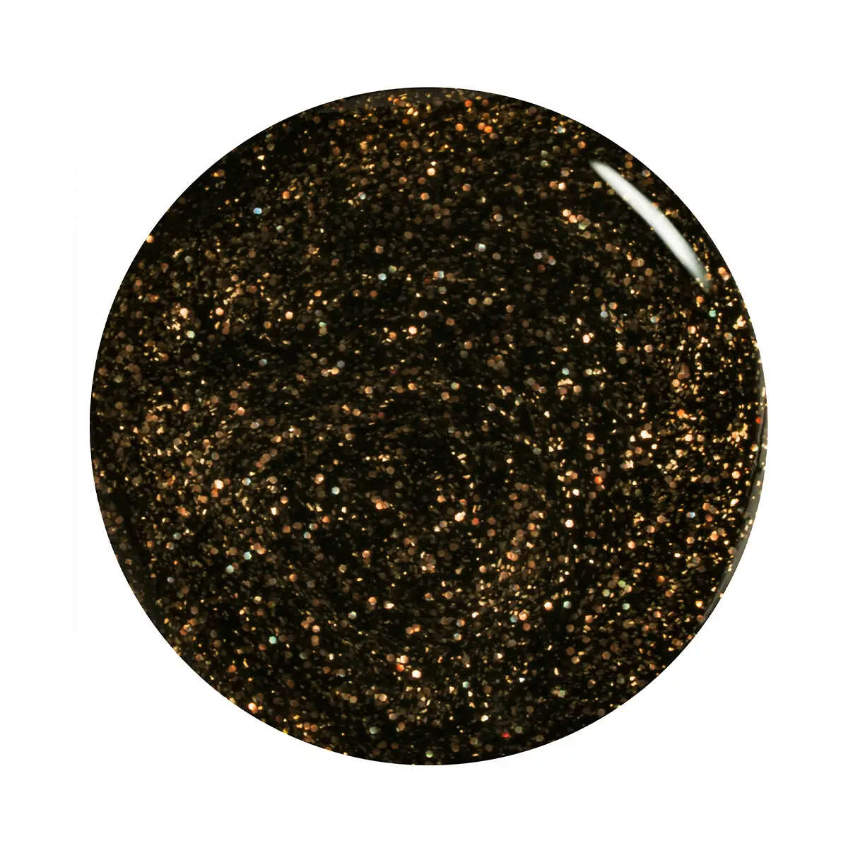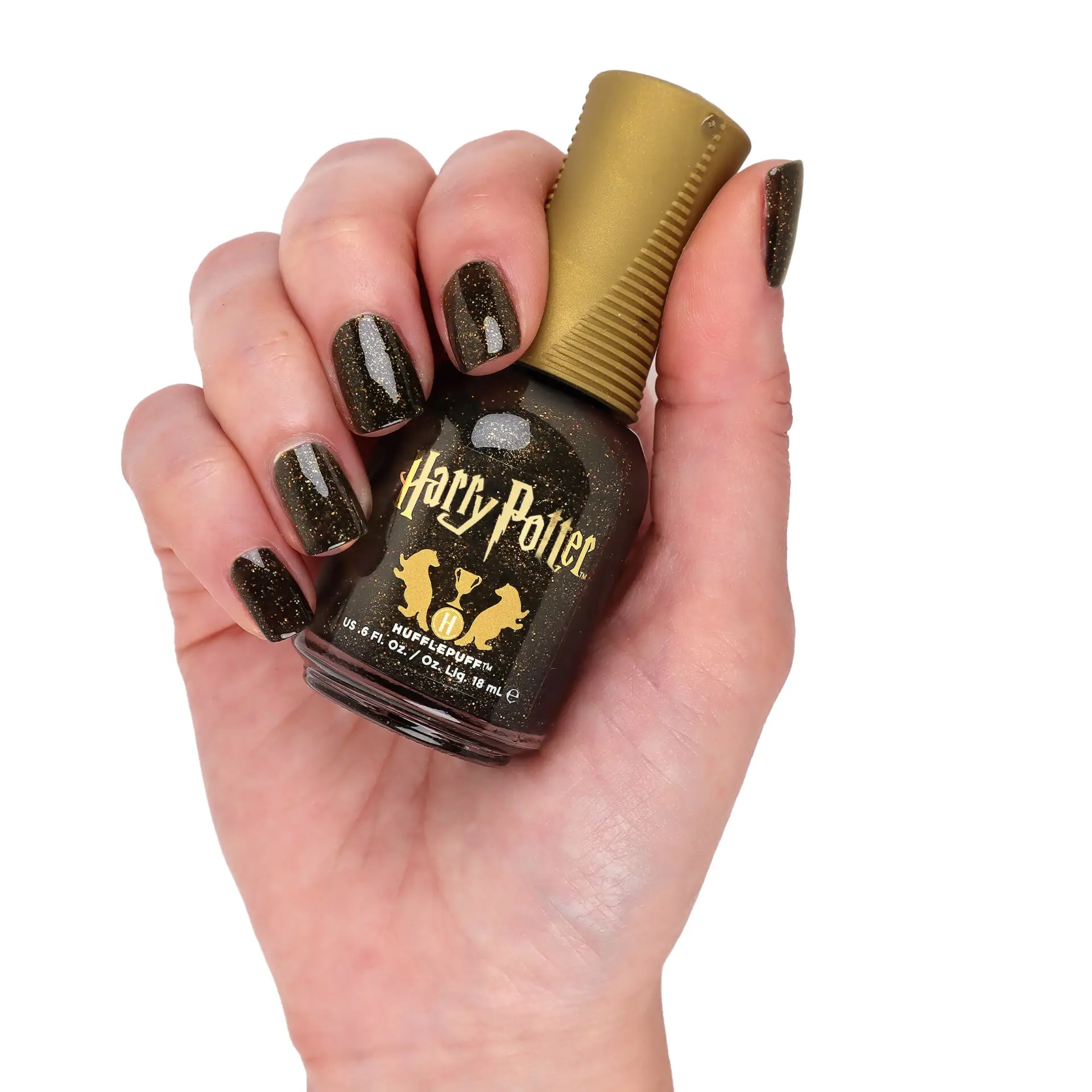 En svart neglelakk med prismatisk effekt og gyllent holografisk shimmer – mørk, glitrende og intens, inspirert av Hufflepuff.