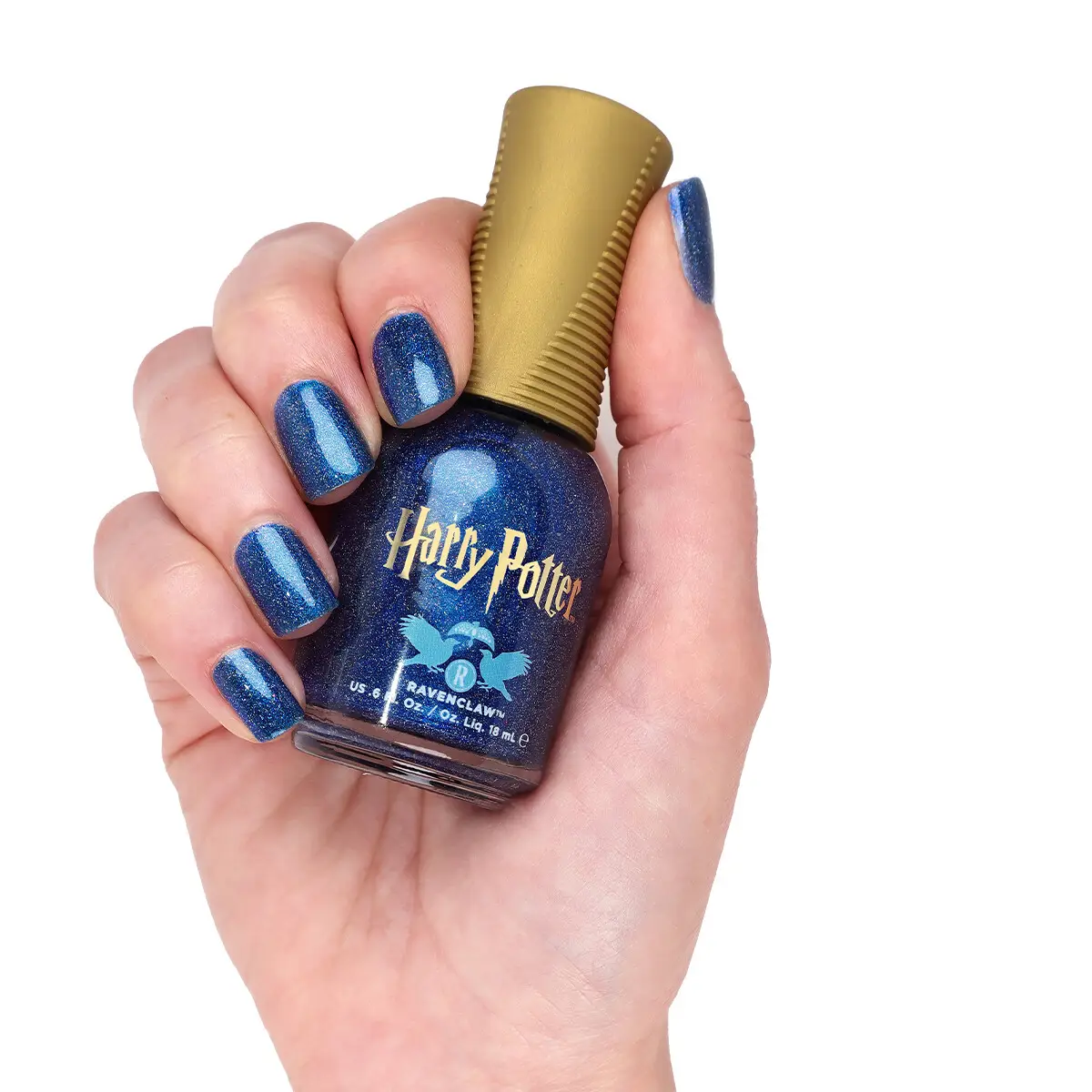 En blå neglelakk med prismatisk effekt og sølvholografisk shimmer – klar og kjølig med diamantlignende glød, inspirert av Ravenclaw.