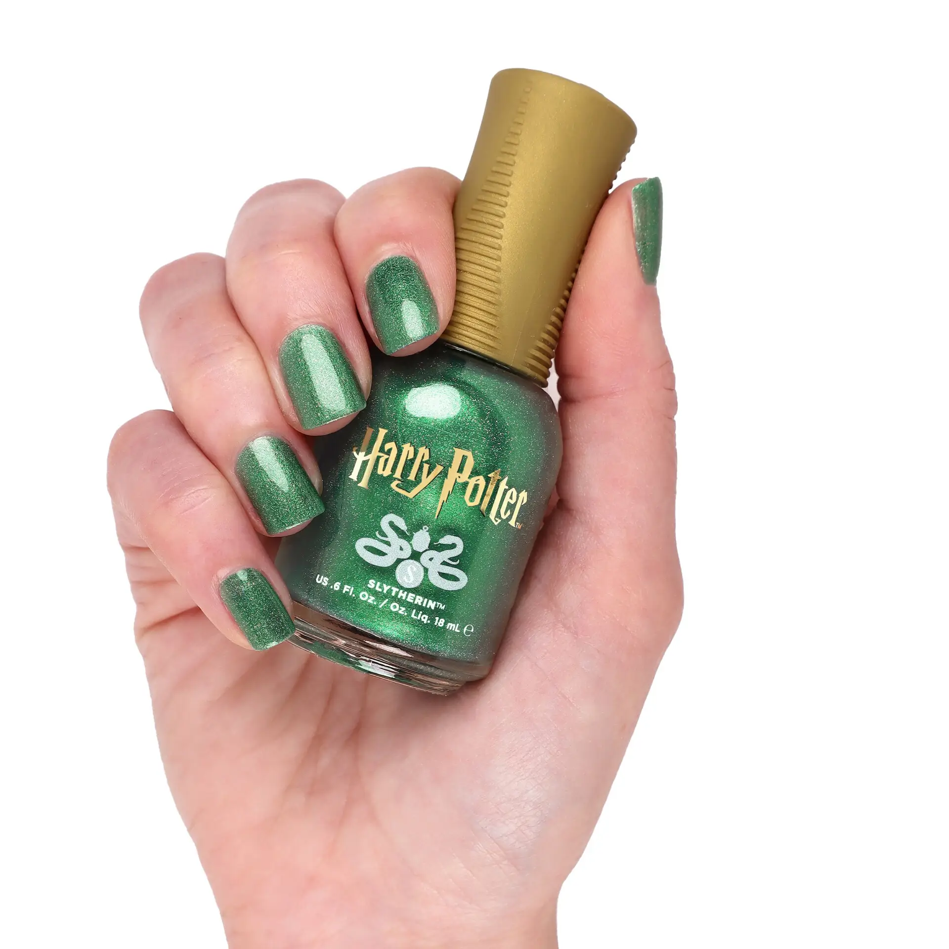 En smaragdgrønn neglelakk med prismatisk effekt og holografisk shimmer – dyp og juvellignende, inspirert av Slytherin.