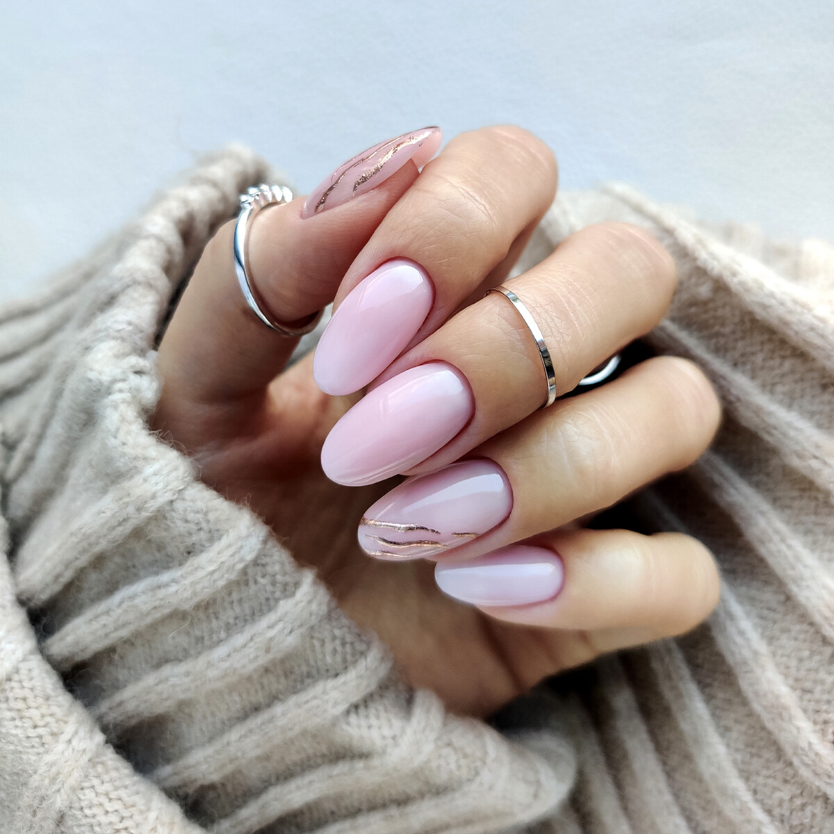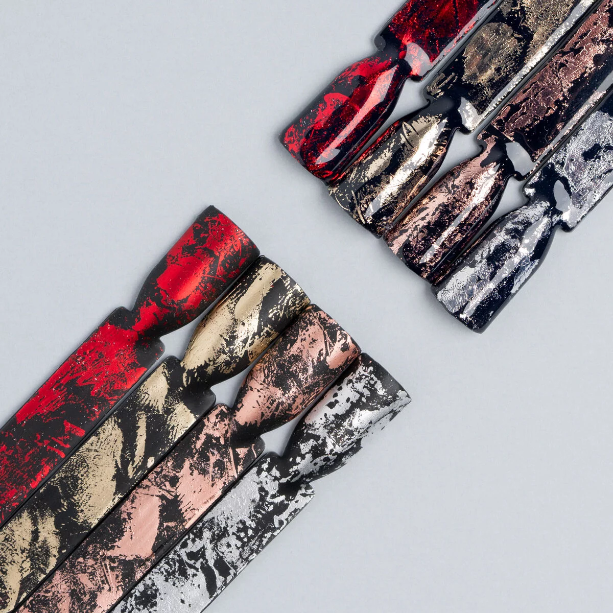 Et roségullfarget metallisk overføringsfolie som tilfører manikyren en markant aksent og gir hele looken et nytt uttrykk.
