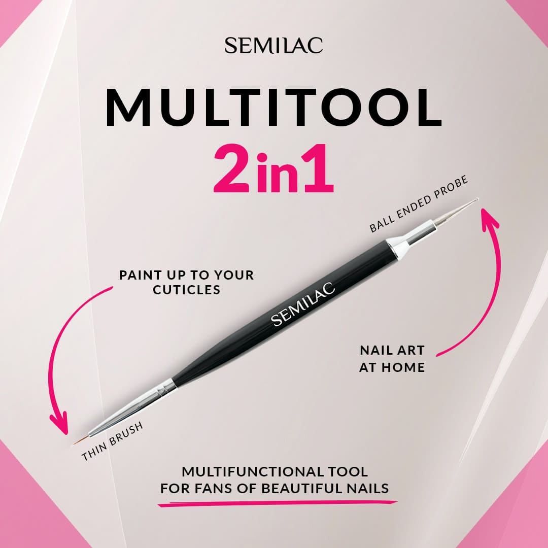 Semilac Multitool 2in1 er et praktisk og allsidig verktøy som kombinerer to ulike tupper i én smart løsning. Den ene enden har en tynn pensel med 7 mm langt bust – perfekt for nøyaktig påføring av hybridlakk helt inntil neglebåndene, samt for å lage rette og tynne linjer i negledesign.