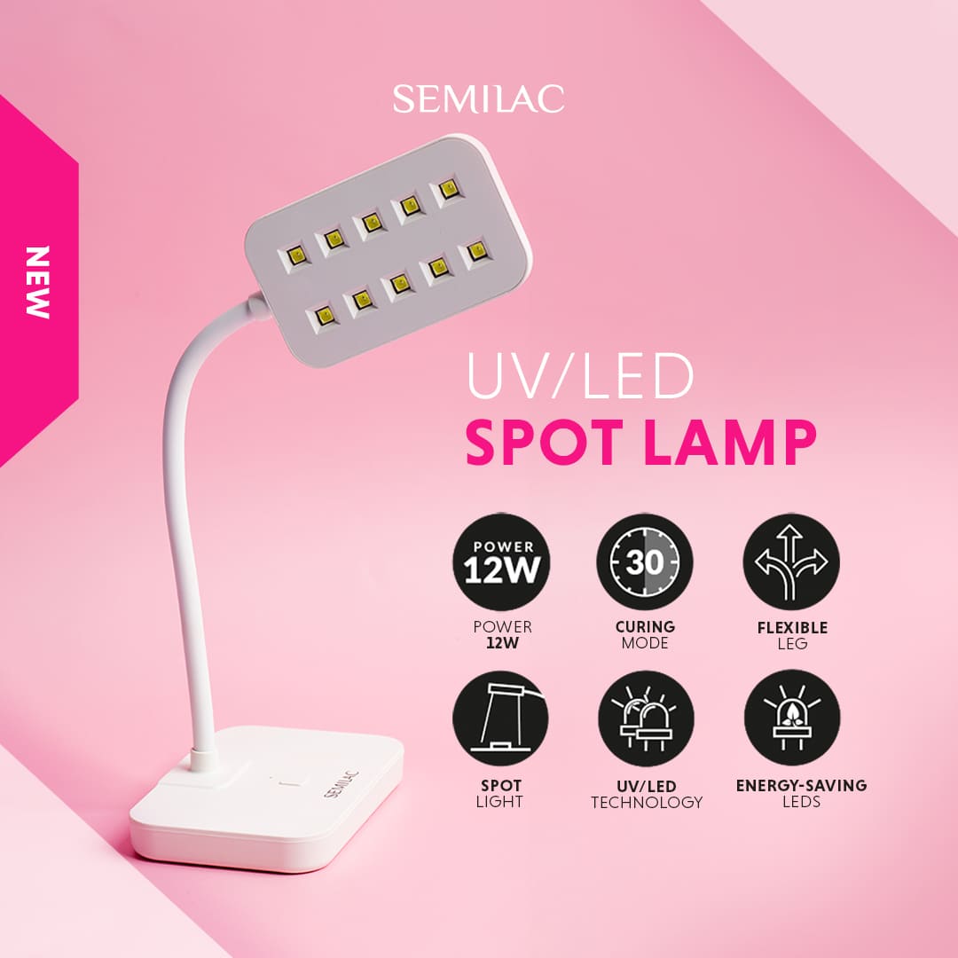 Semilac Spot Lamp UV/LED 12W er det essensielle verktøyet til negleforlengelser og detaljert manikyrarbeid. Den er spesielt utviklet for forherding av tipper, dekorasjoner og geleprodukter, slik at du får optimal kontroll før full herding i en UV/LED-lampe.