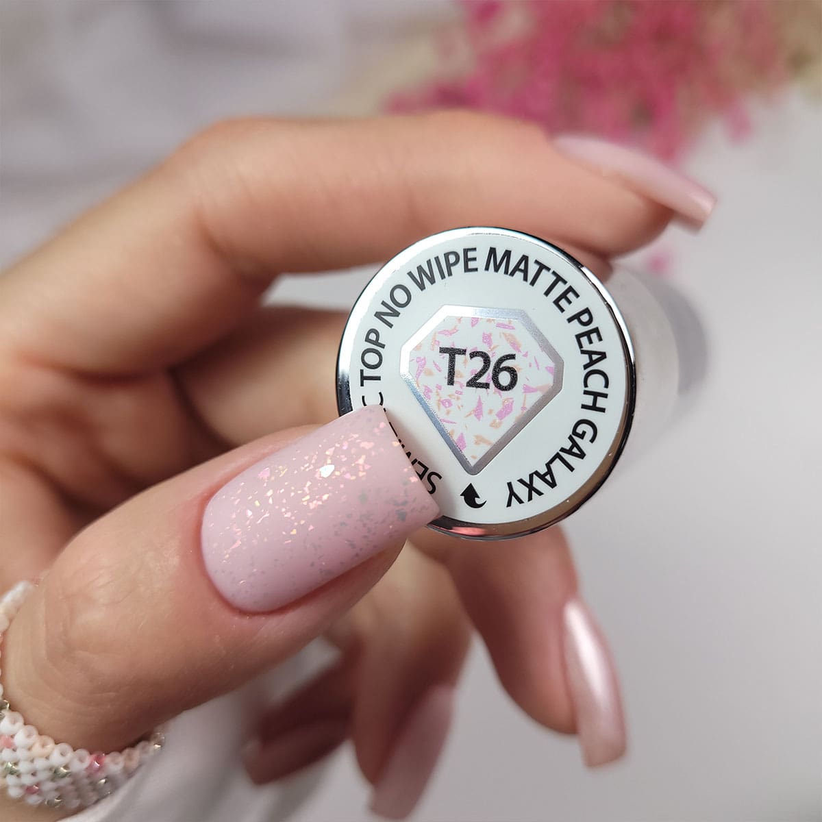 Semilac Top No Wipe Matte Peach Galaxy gir en spektakulær finish som kombinerer moderne matt effekt med glødende, uregelmessige flak som skinner i rosa og røde toner, avhengig av lyset.