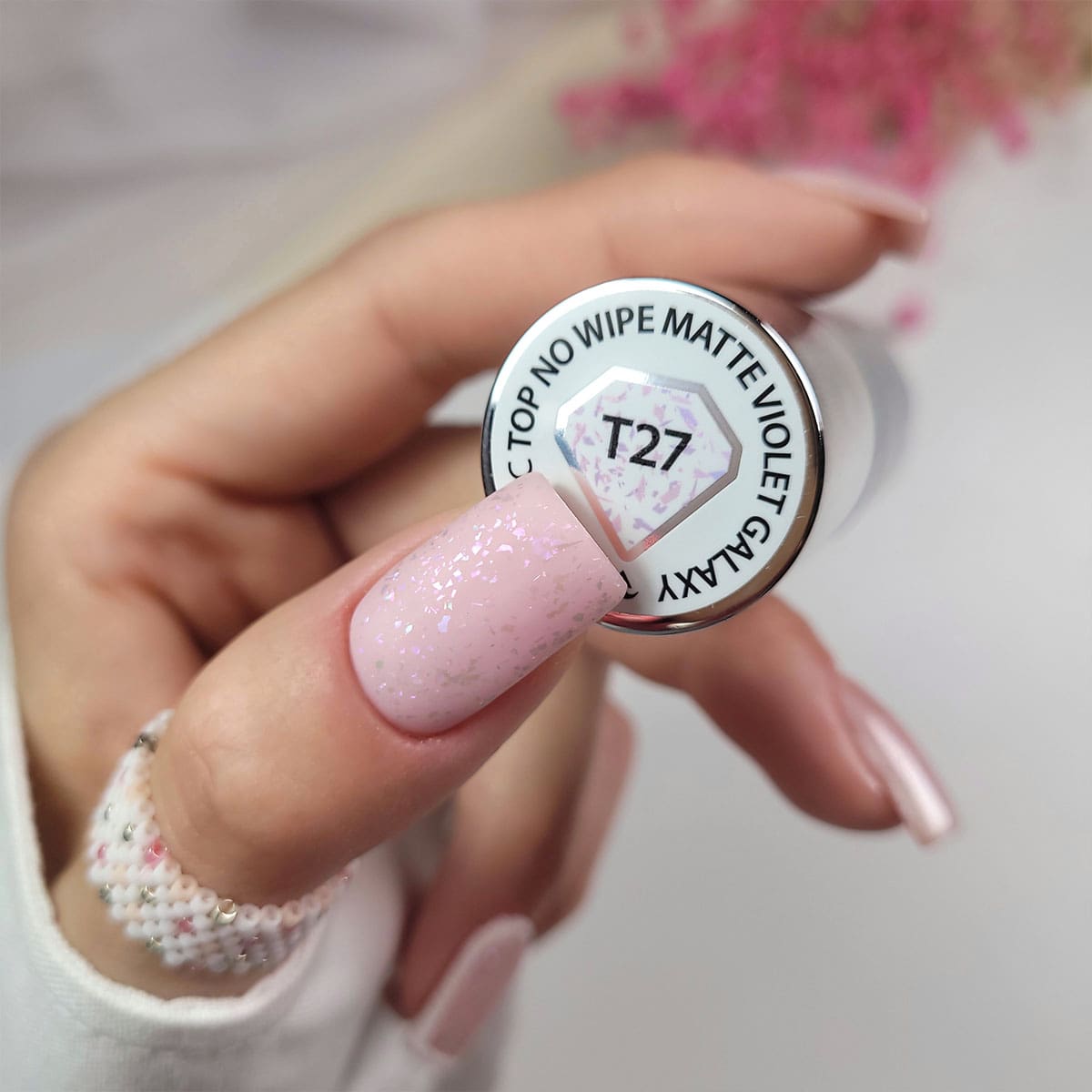Semilac Top No Wipe T27 Matte Violet Galaxy er en unik topplakk som gir neglene et sofistikert, matt preg med innslag av glitrende Galaxy-flak i rosa, lilla og blå nyanser.