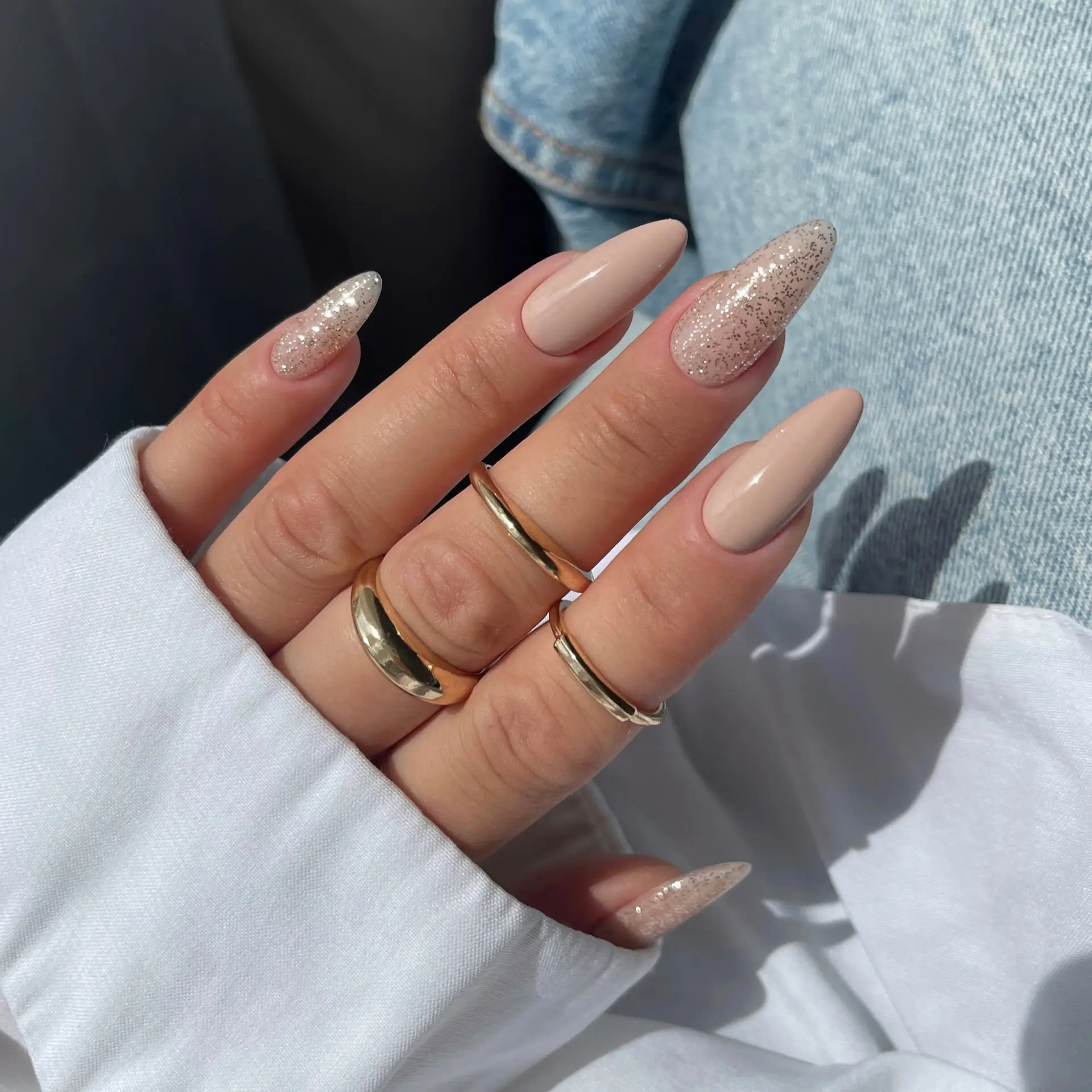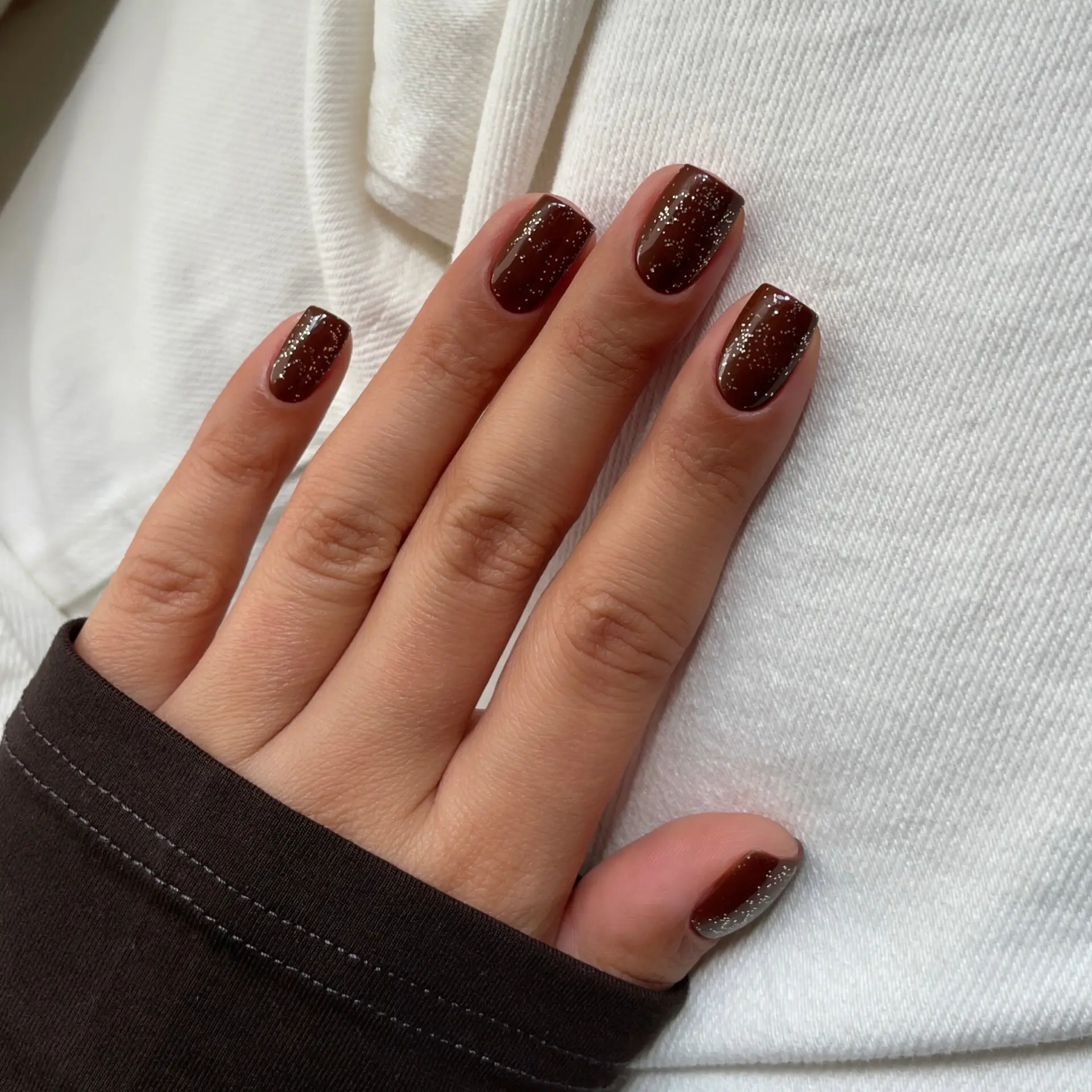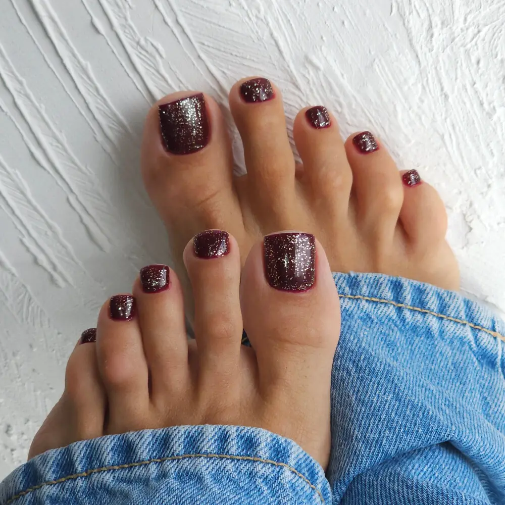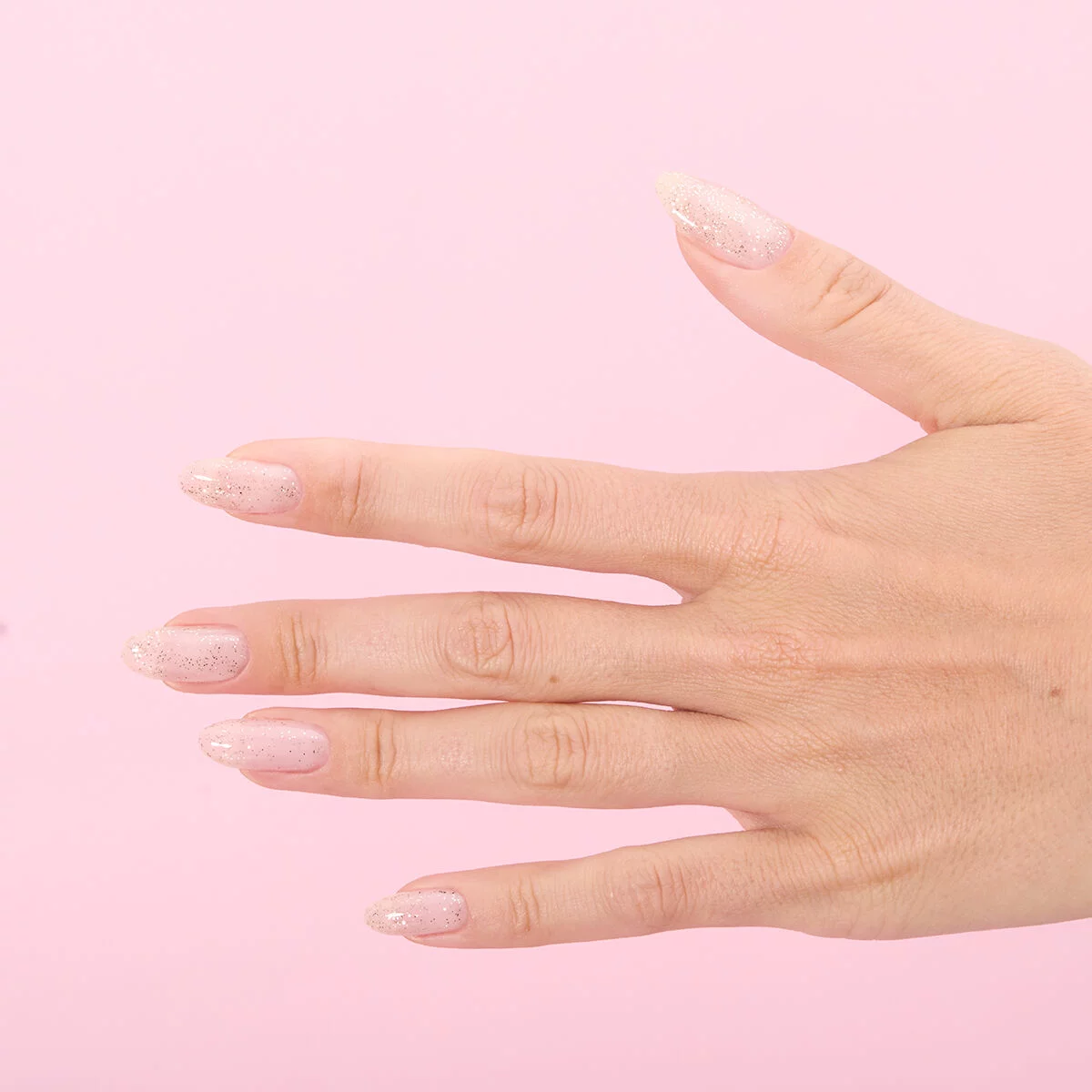 Transparent topplakk med jevnt fordelte gullpartikler og flak som gir en diskré, luksuriøs skimmer effekt på neglene inspirert av quiet luxury estetikken. Den løfter både enkle nude-nyanser og dype burgundertoner, men harmonerer spesielt vakkert med jelly-lakker, der de gyldne partiklene fremhever glass-effekten og gir en elegant, strålende finish.
