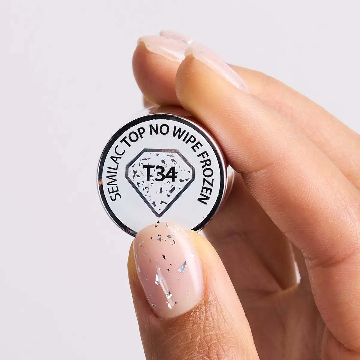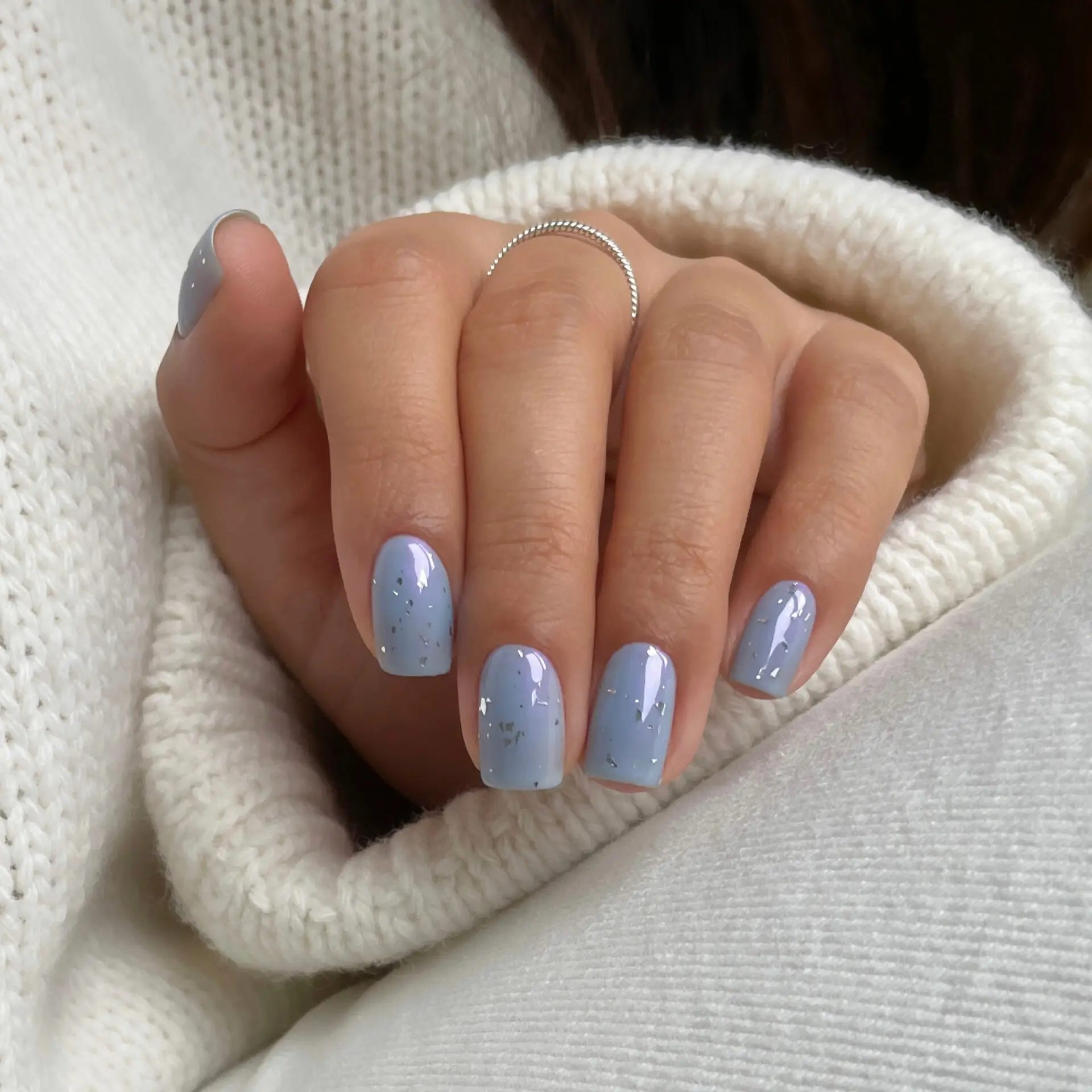 En transparent topplakk med sølvflak som gir et delikat og glitrende vinterpreg.