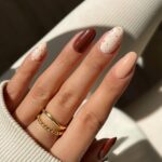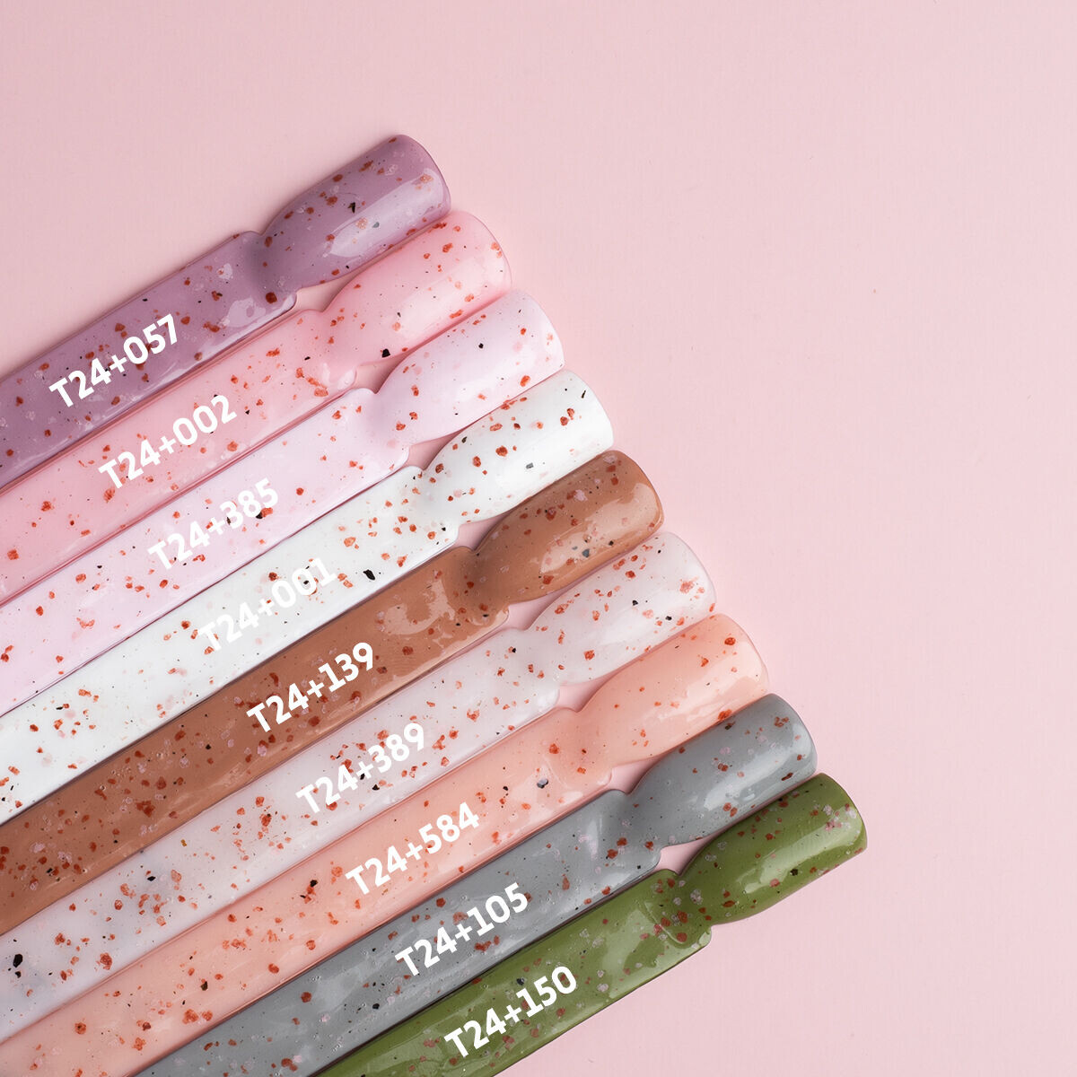 En transparent topplakk uten klebrig lag, beriket med uregelmessige partikler i nyanser av rosa og brunt. Gir en delikat boho-effekt som passer perfekt til lyse, melkefargede toner.